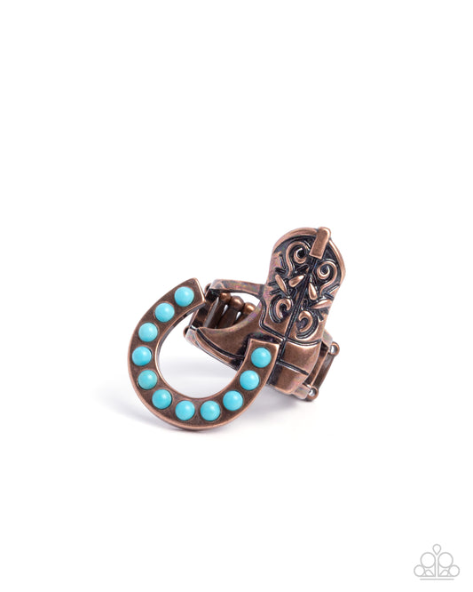 Western Wraparound - Copper Cowboy Boot Turquoise Crackle Stone Horseshoe Ring - Paparazzi Accessories