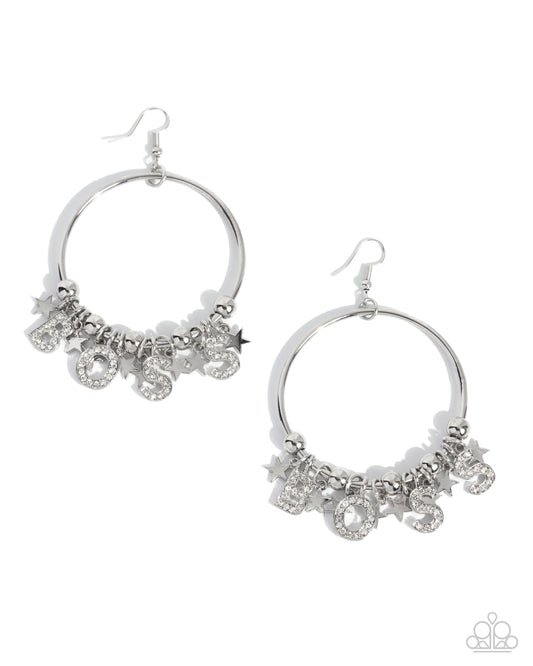 Boss Level - White Rhinestone "BOSS" Silver Front-Facing Hoop Fishhook Earrings - Paparazzi Accessories