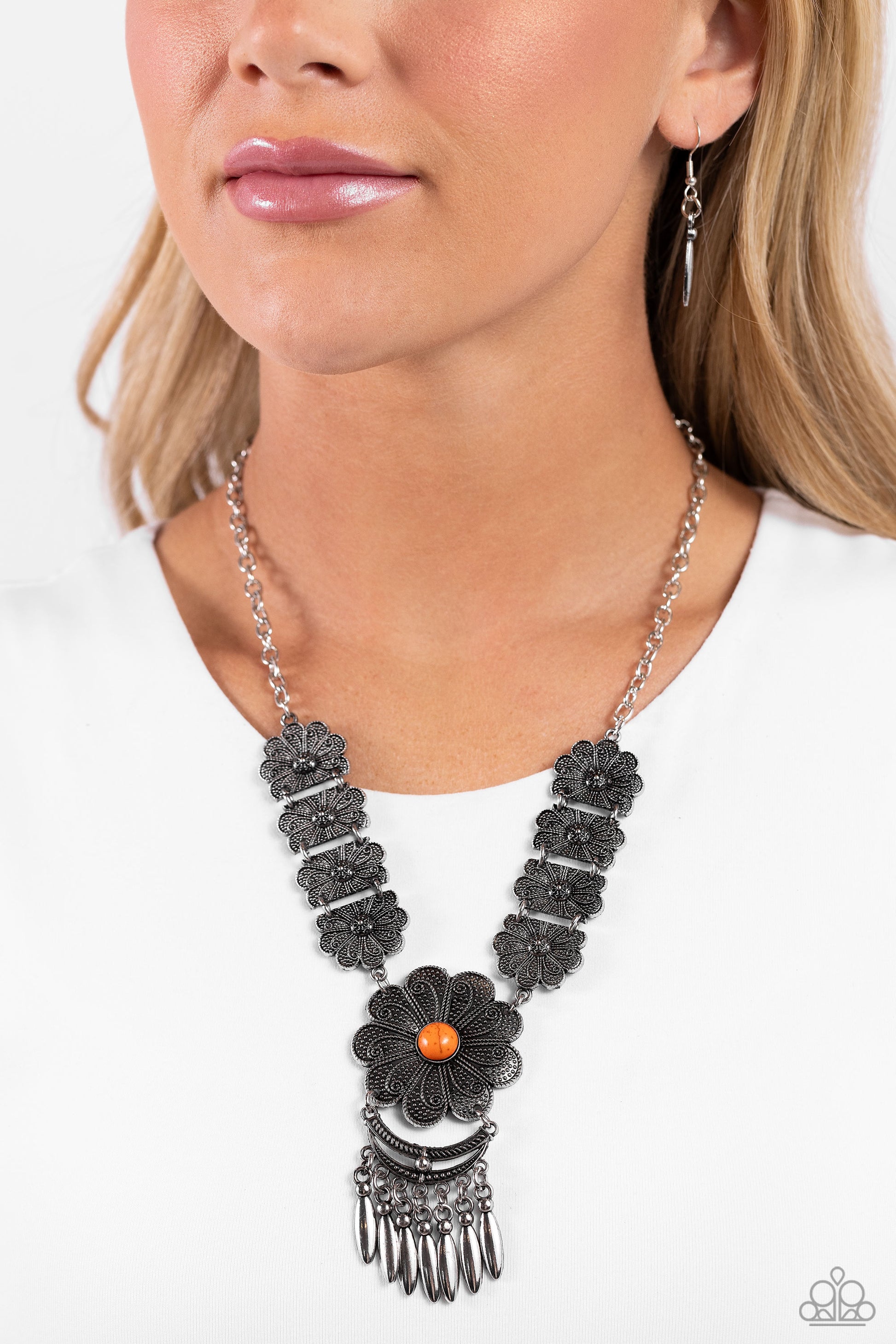 A collection of filigree and stud-accented antiqued silver floral plates connects below the collar, joining into an elaborate oversized floral pendant. Featuring an orange stone center, the oversized flower gives way to a high-sheen silver bar fringe that dangles from textured curved bars of silver, adding hints of movement to the bohemian-inspired piece. Features an adjustable clasp closure. As the stone elements in this piece are natural, some color variation is normal.