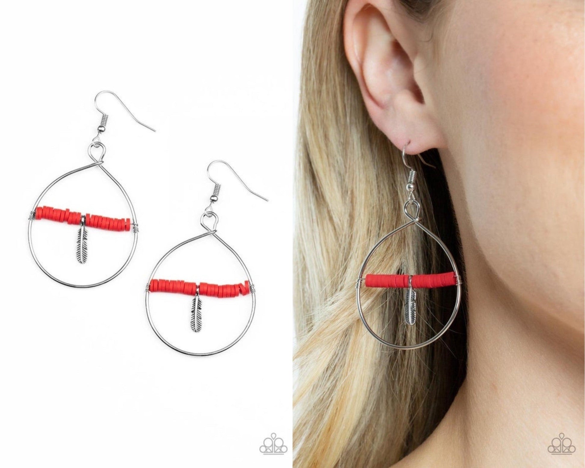 Infused with a dainty silver feather charm, a dainty row of rubbery red discs are threaded along a metallic rod inside an airy silver hoop for a free-spirited fashion. Earring attaches to a standard fishhook fitting.