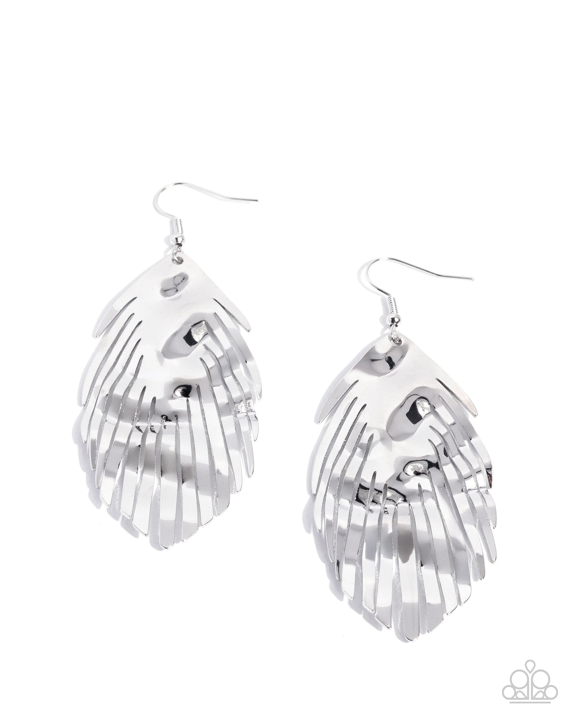 Rippling with tactile textures, an abstract silver palm-like leaf with snipped sharp ends sways below the ear for a simply seasonal fashion. Earring attaches to a standard fishhook fitting.