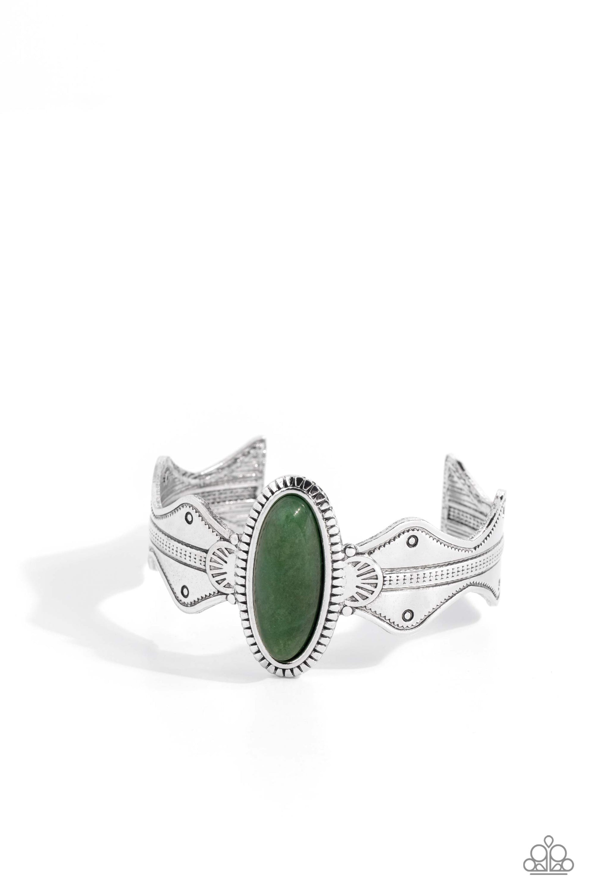 An oblong jade stone is pressed into the center of a textured silver frame that sits between two wavy and decorative silver bars, joining into an adventurous cuff around the wrist.
