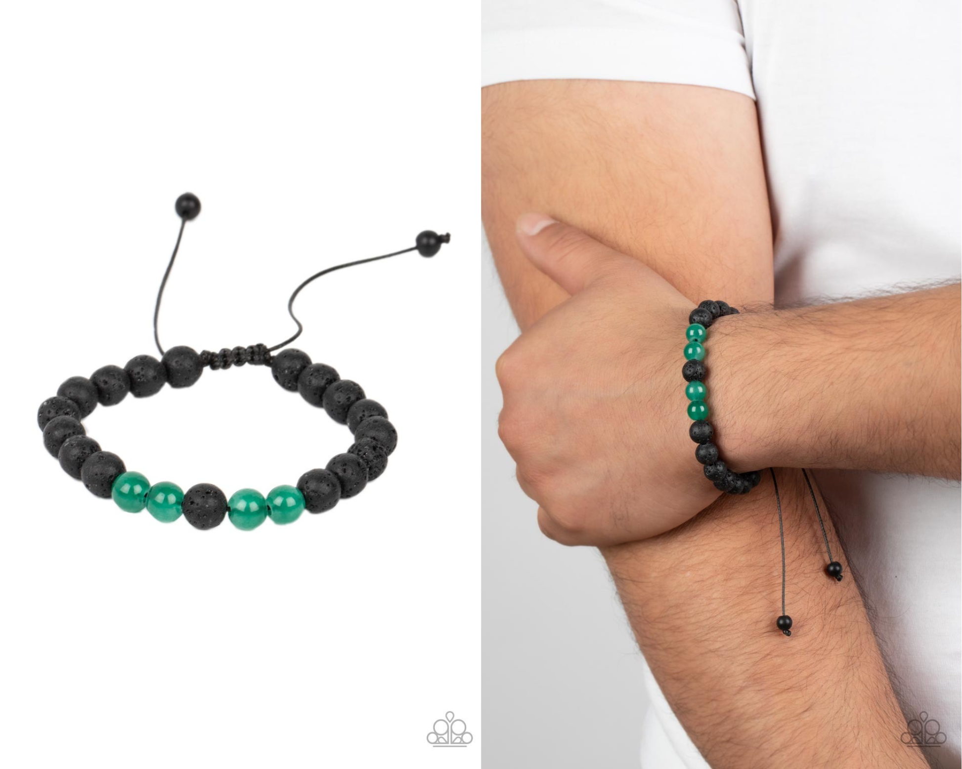 An earthy collection of black lava rock and jade stone beads are threaded along a black cord around the wrist, resulting in a seasonal pop of color. Features an adjustable sliding knot closure.