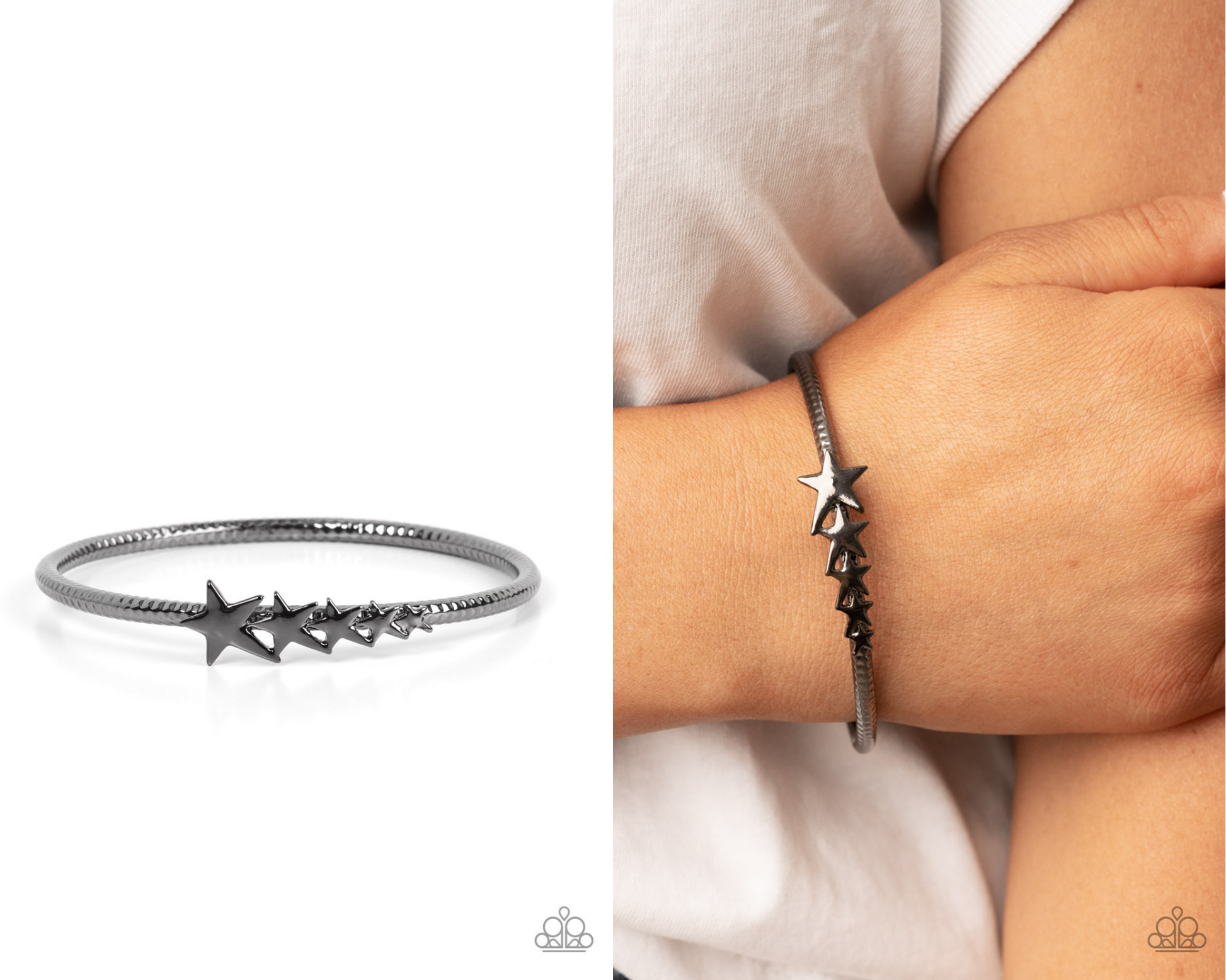 Glistening gunmetal stars graduate in size across the center of a textured gunmetal bangle, creating a stackable stellar centerpiece around the wrist.