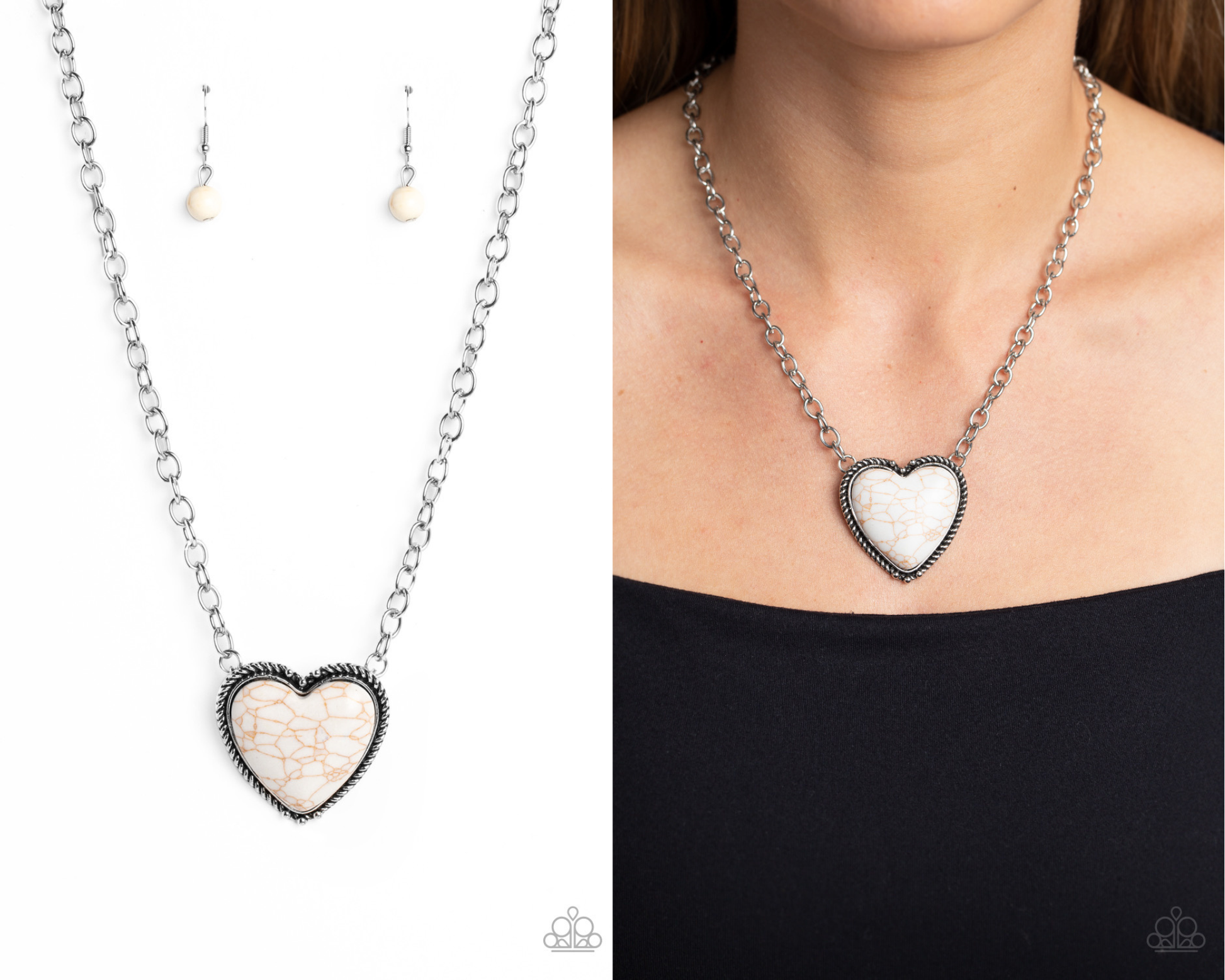 Dangling from the bottom of a thick silver chain, an oversized, white stone is pressed into a textured, studded, silver heart frame for some southwestern sass. Features an adjustable clasp closure. As the stone elements in this piece are natural, some color variation is normal.