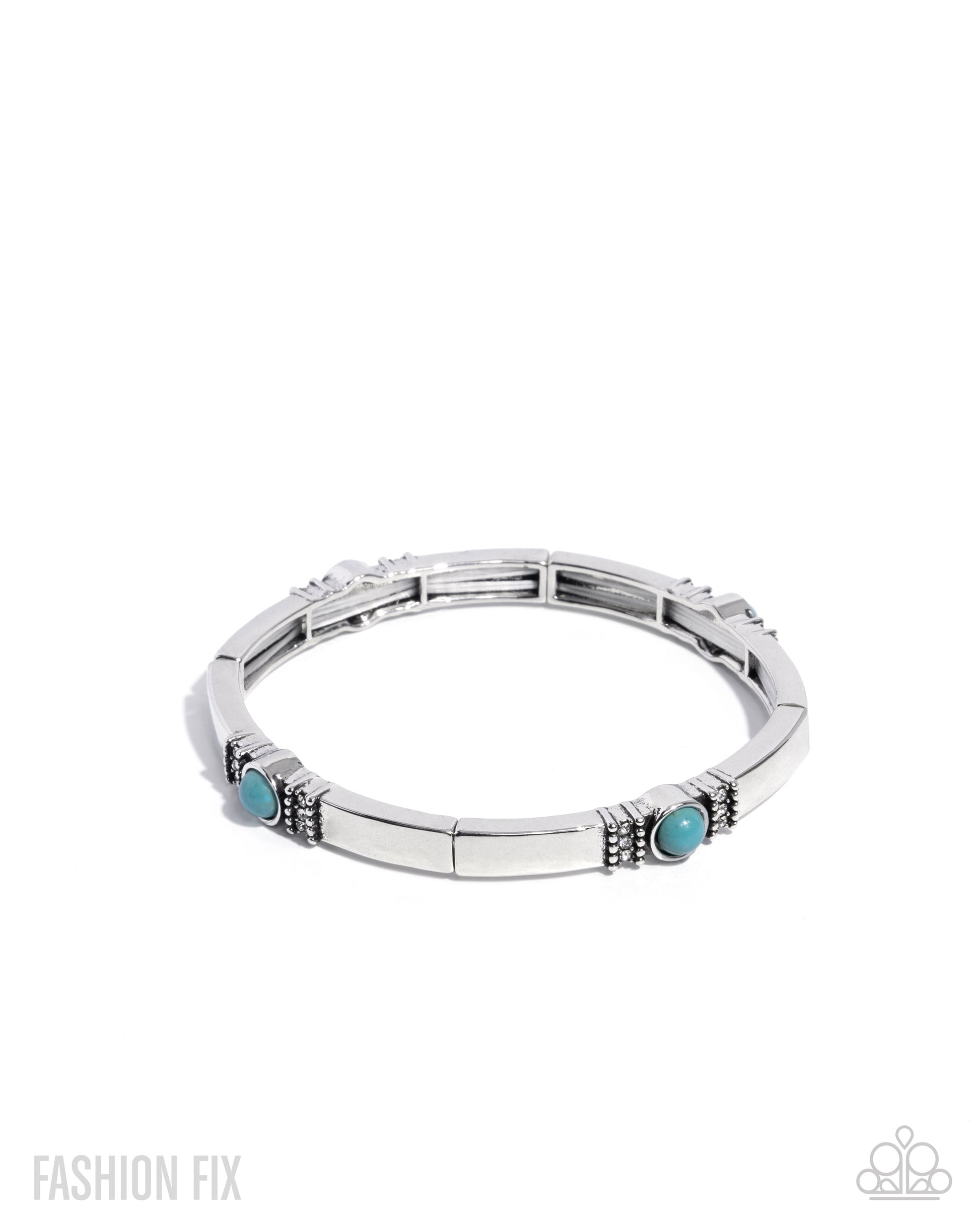 Infused along elastic stretchy bands, a collection of sleek silver rectangular frames wrap around the wrist for a minimalistic design. Dainty turquoise stones dot along each frame with dainty white rhinestones framing each side of the stone for added texture and natural shimmer. As the stone elements in this piece are natural, some color variation is normal.