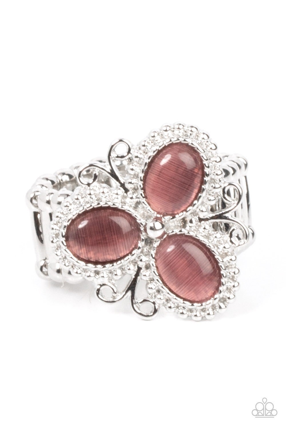 Three oval purple cat's eye stones are encased in studded silver fittings featuring filigree accents, blooming into a magical floral centerpiece atop the finger. Features a stretchy band for a flexible fit.