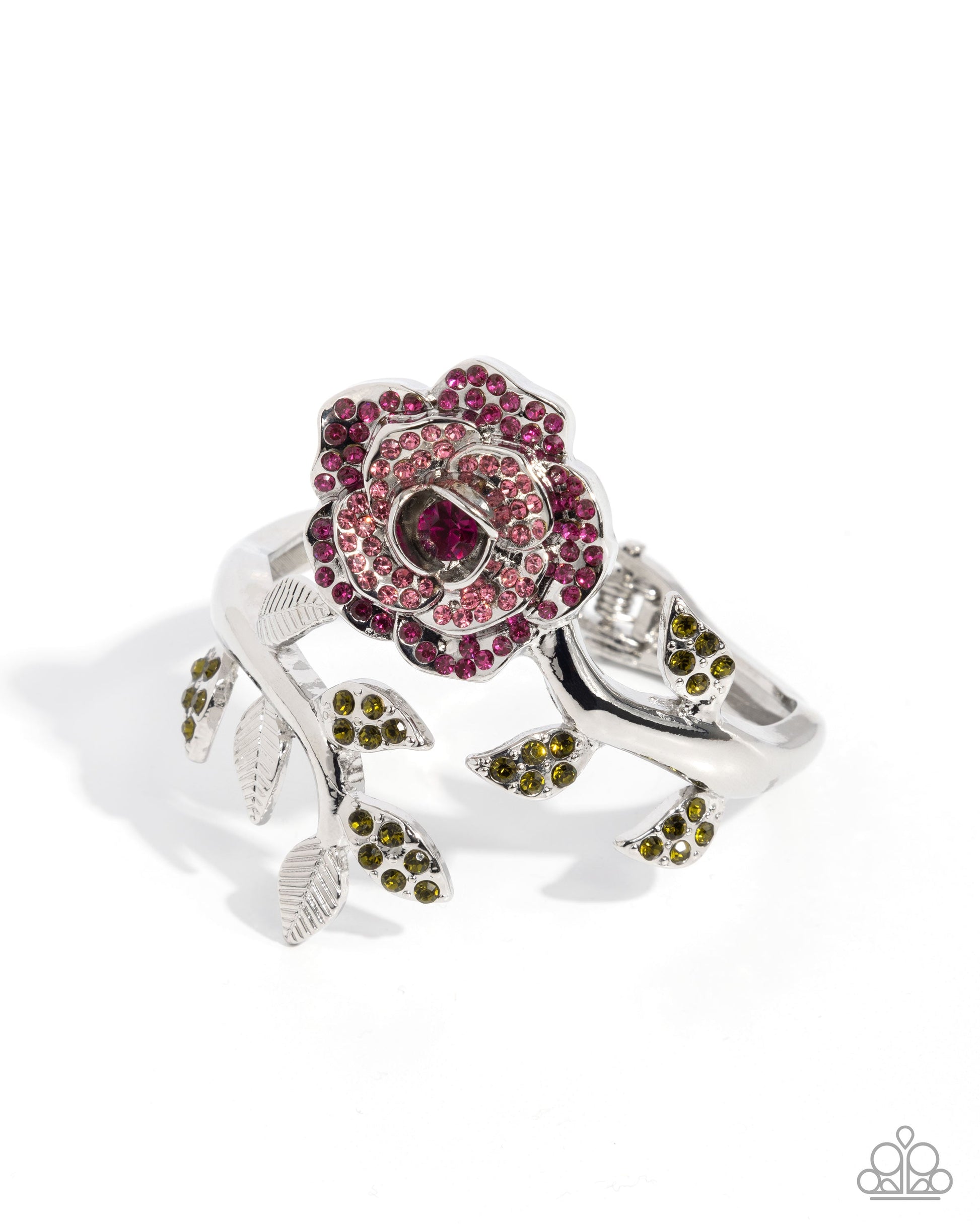 Dotting along crimped three-dimensional rose layers, a collection of fuchsia and rose rhinestones leads the eye to its fuchsia gem center for an opulent pop of earthy color as it blooms atop curly silver vines dotted with textured and olive rhinestone-embellished silver leaves. Features a hinged closure.