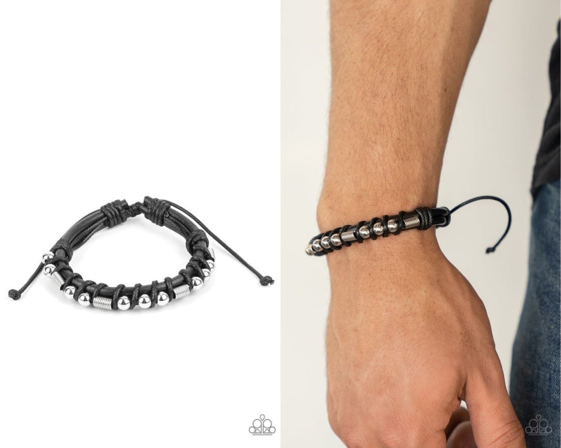 Wrapped into place with glossy black thread, shiny silver beads and cylindrical coils are threaded along a double layer of thick black leather cording creating a rustic fashion around the wrist. Features an adjustable sliding knot closure.