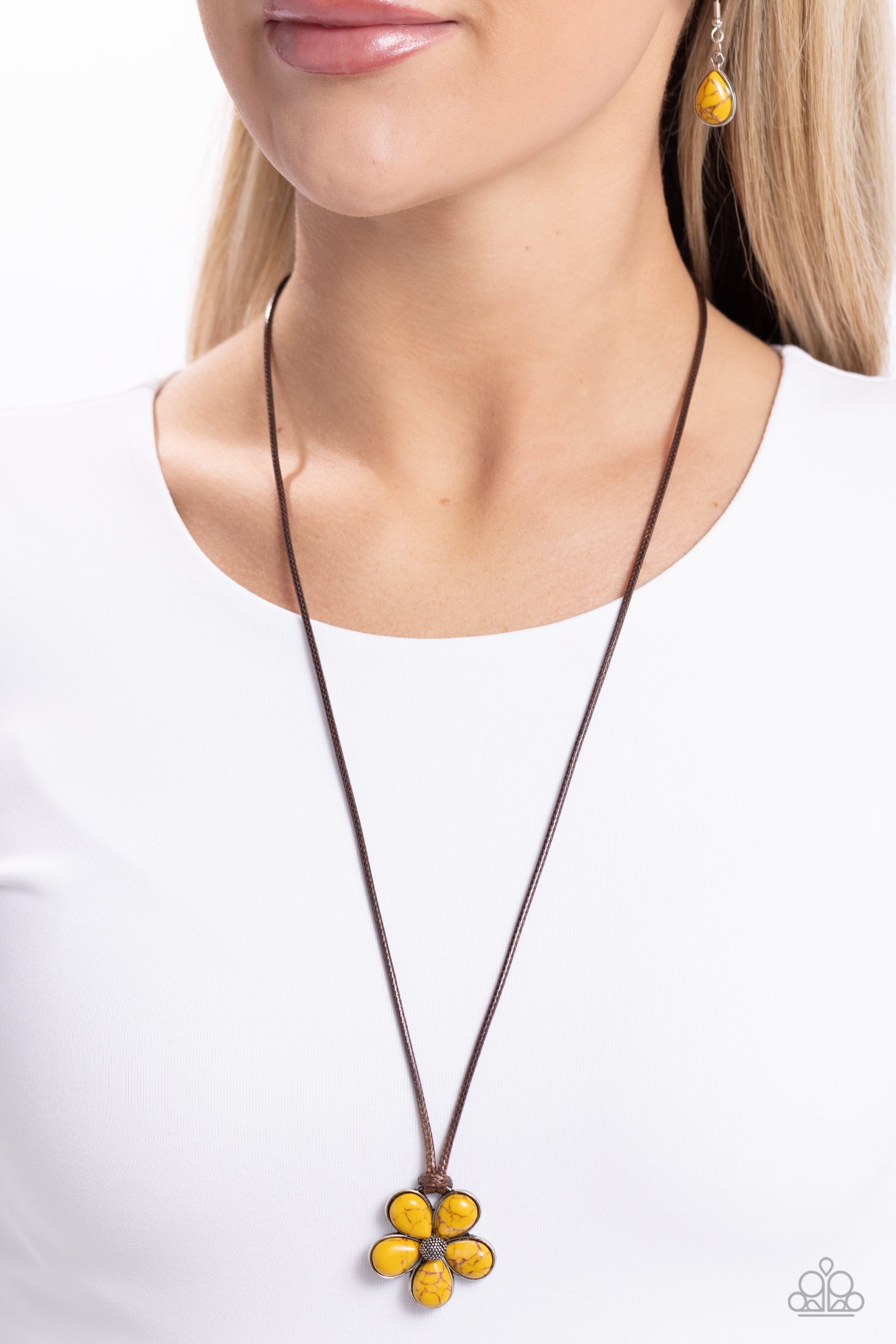 Fluttering from a brown cord, an oversized flower with yellow stone petals blooms around a studded silver center for a pop of earthy color. Features an adjustable clasp closure. As the stone elements in this piece are natural, some color variation is normal.