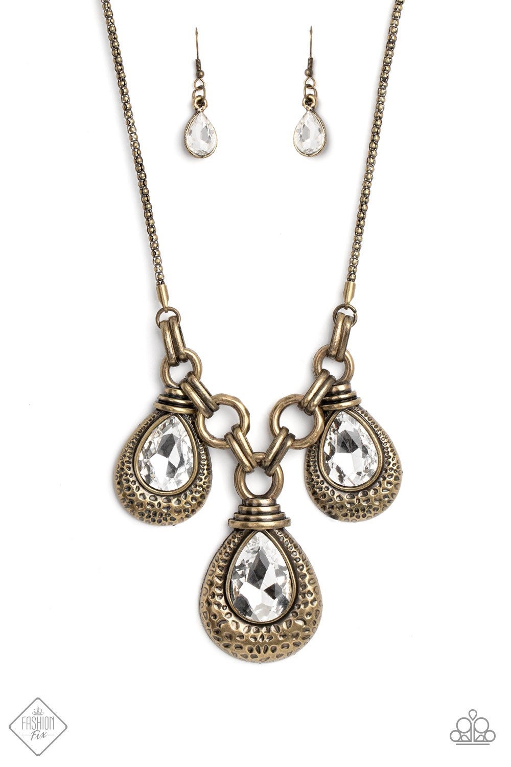 Oversized links of brass are artfully interlocked, laying the groundwork for a dynamic display of industrial grit. A trio of oversized white, faceted, teardrop gems drips from the chainlinks above, each set inside a textured brass frame topped with a stack of brass rings. The metallic mashup is suspended from a brass ball chain, introducing a hint of unexpected homespun character to the statement-making design. Features an adjustable clasp closure.