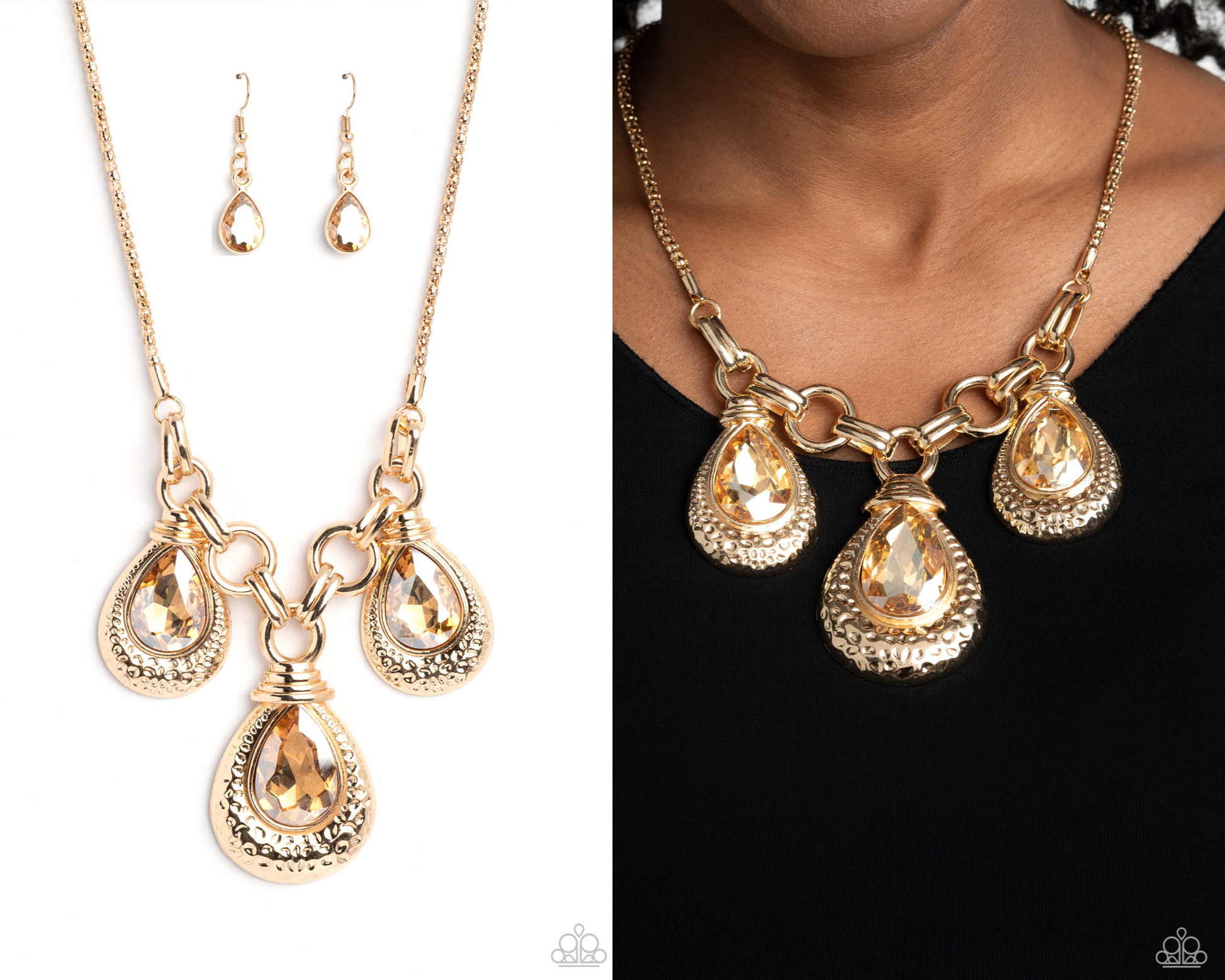 Oversized links of gold are artfully interlocked, laying the groundwork for a dynamic display of industrial grit. A trio of oversized champagne, faceted, teardrop gems drips from the chainlinks above, each set inside a textured gold frame topped with a stack of gold rings. The metallic mashup is suspended from a gold ball chain, introducing a hint of unexpected homespun character to the statement-making design. Features an adjustable clasp closure.