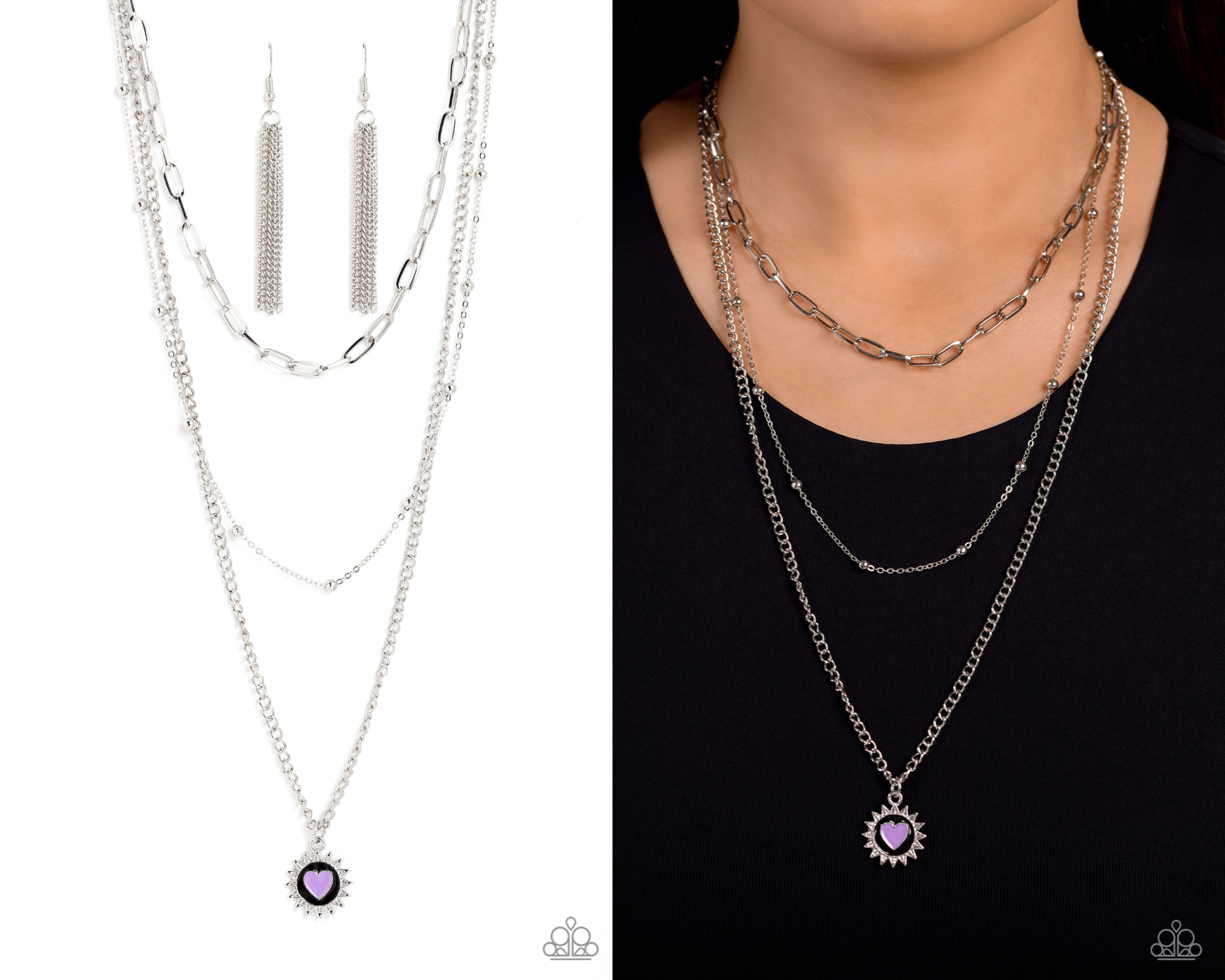 Three silver chains cascade in various lengths across the chest, creating a radiantly edgy display. The centermost chain is dotted with silver studs while a sunburst silver frame, embellished with a black center and a purple painted heart, creates a youthful pendant at the bottom of the longest chain in a colorful finish. Features an adjustable clasp closure.