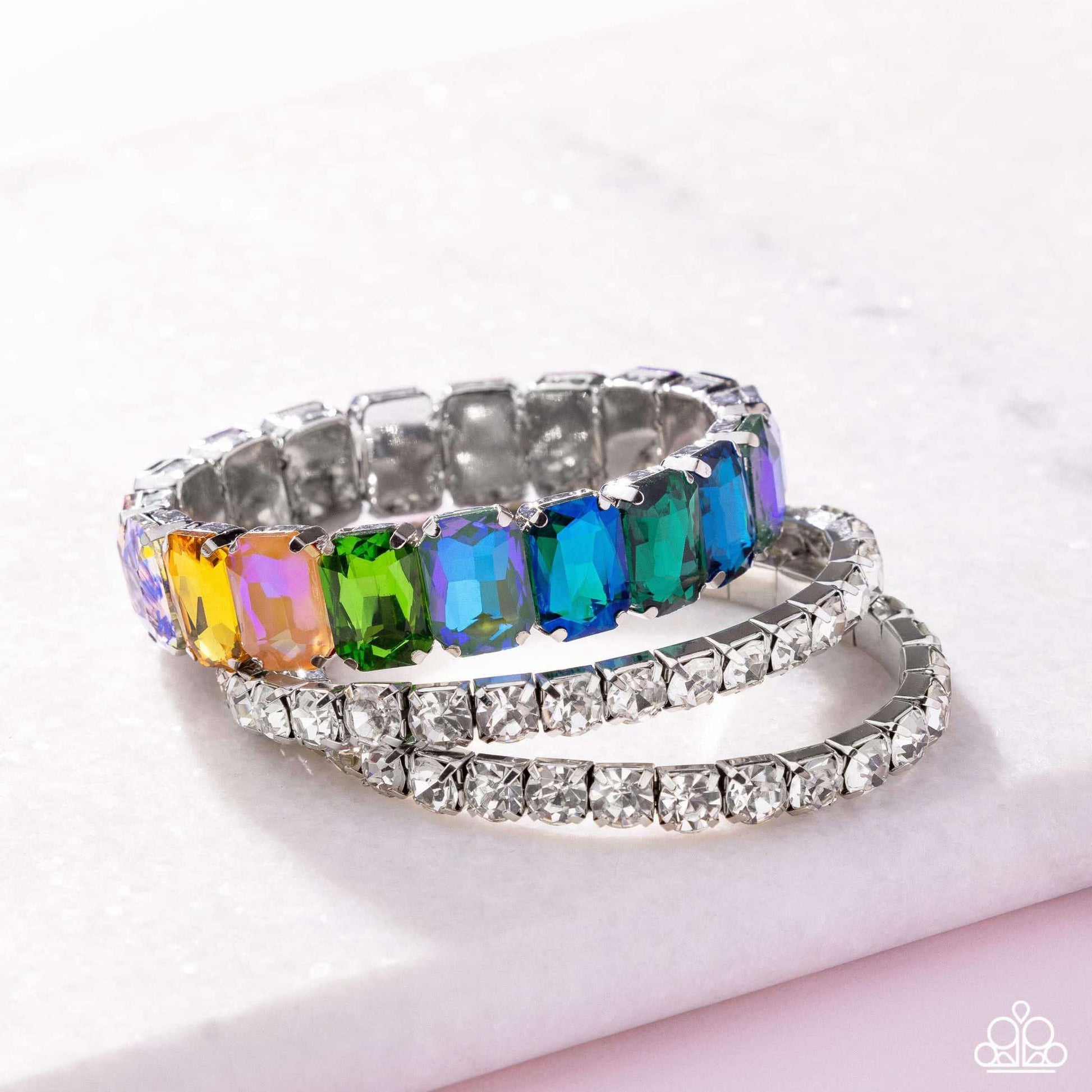 Infused along elastic stretchy bands, a dual-stack of crystal-like white gems pronged in silver square fittings frames a collection of emerald-cut multicolored and UV-shimmery gems in similar pronged silver fittings for a shimmery stack atop the wrist.