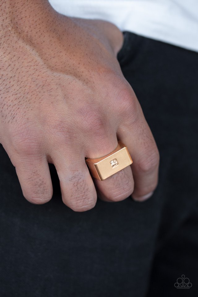 Featuring a kingly square-style cut, a white rhinestone is pressed into the center of a flat rectangular gold frame for a statement look. Features a stretchy band for a flexible fit. Sold as one individual ring.