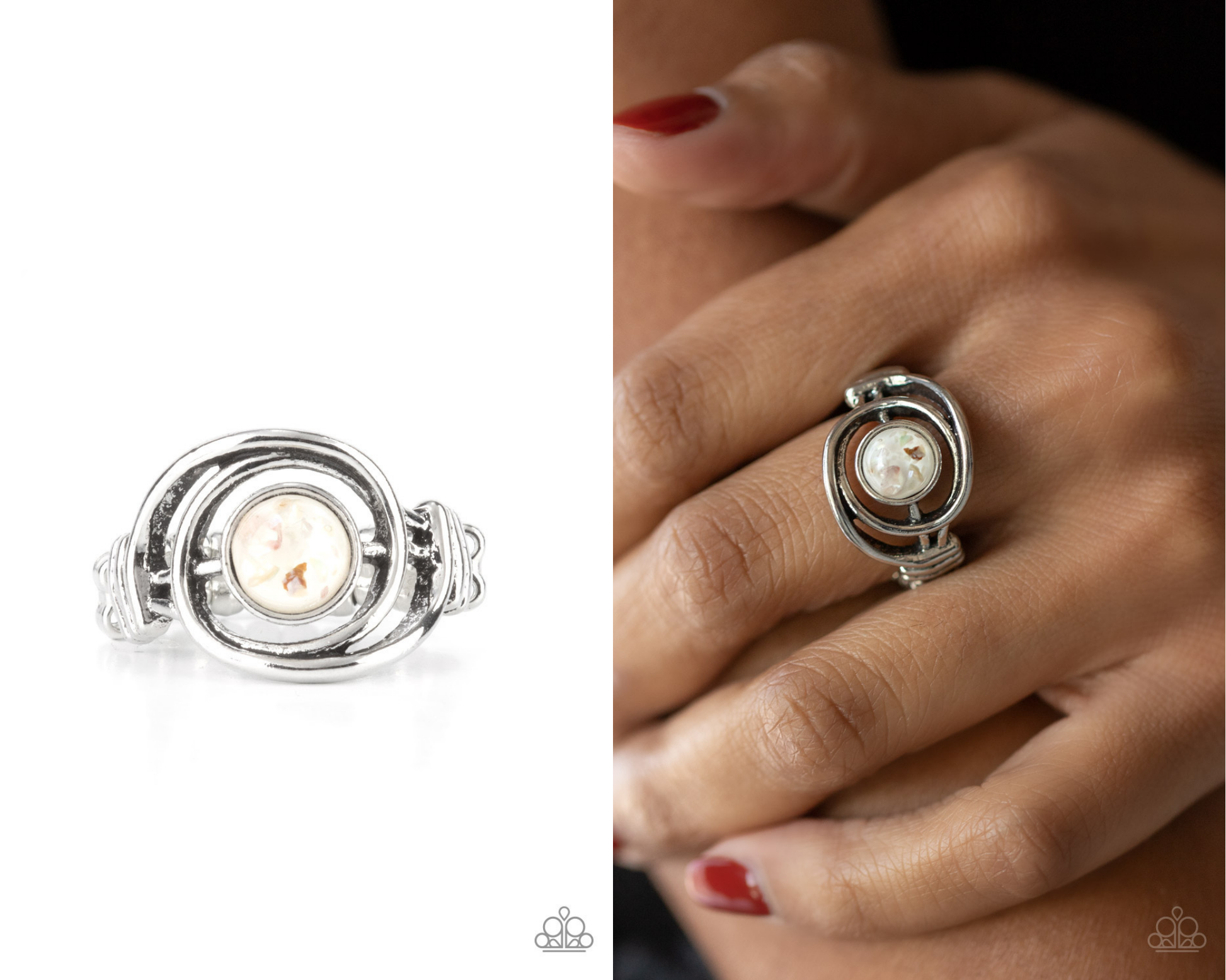 Glistening silver bars swirl around a glassy white bead flecked in iridescent shell, creating an ethereal centerpiece atop the finger. Features a dainty stretchy band atop the finger.