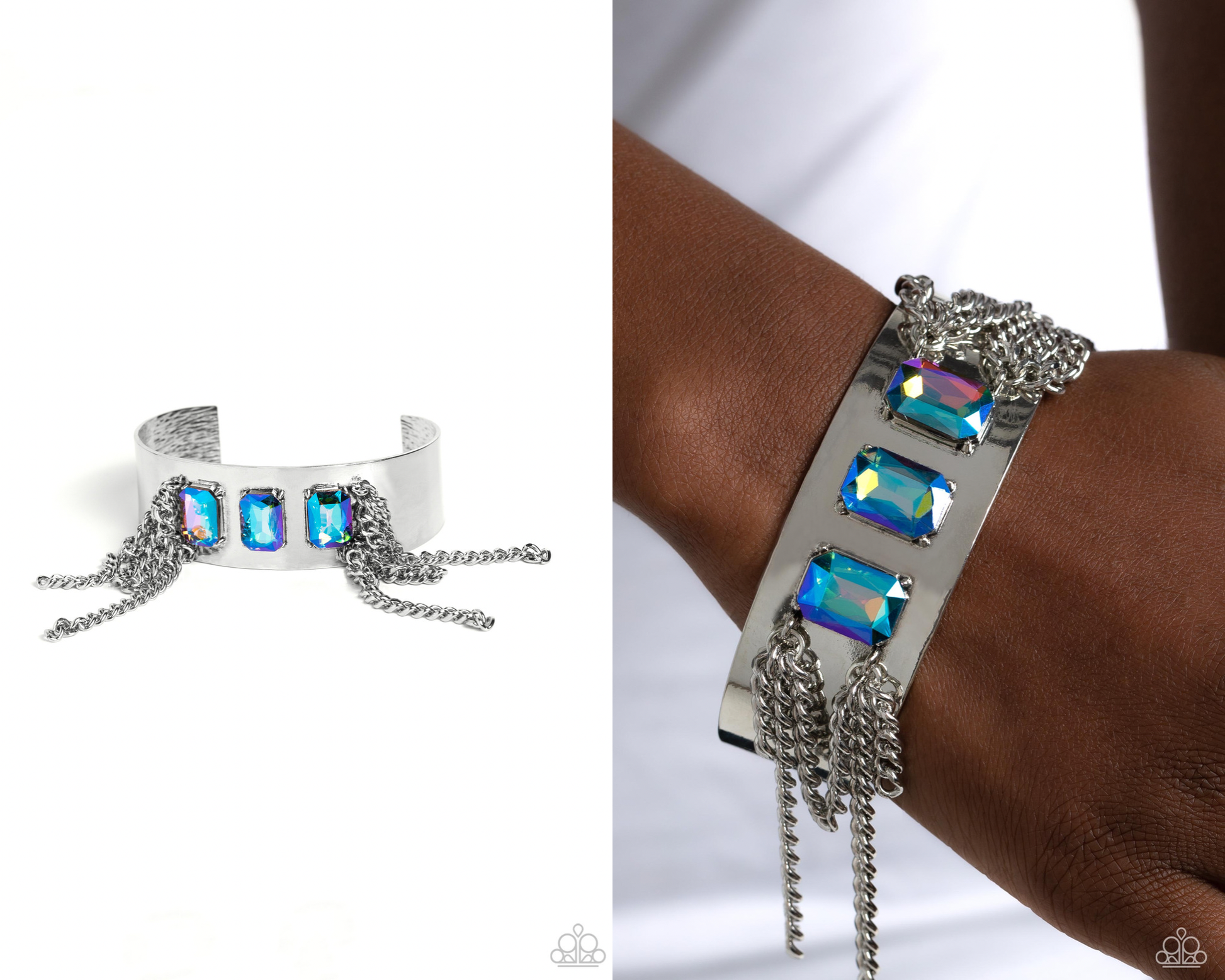 A thick, industrial silver cuff is topped by three brilliant UV-shimmery, emerald-cut gems. Strands of silver curb chain stream from each side of the trio of glitz, adding undeniable drama and eye-catching movement to the piece.