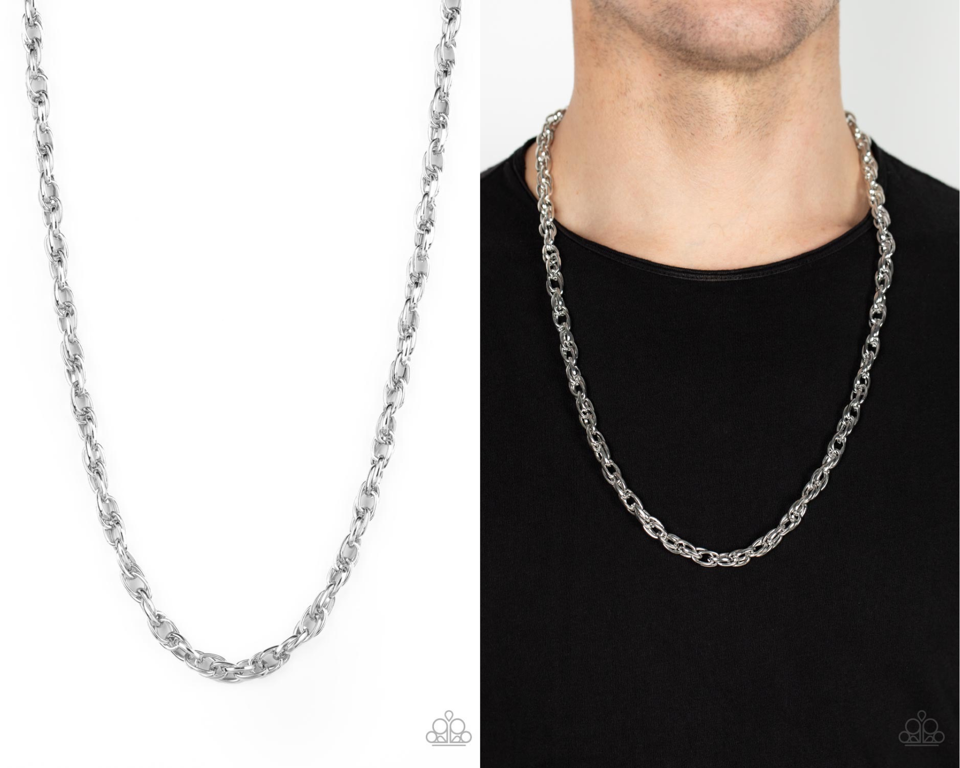 Glistening silver links ornately interlock across the chest, resulting in an edgy industrial centerpiece. Features an adjustable clasp closure.