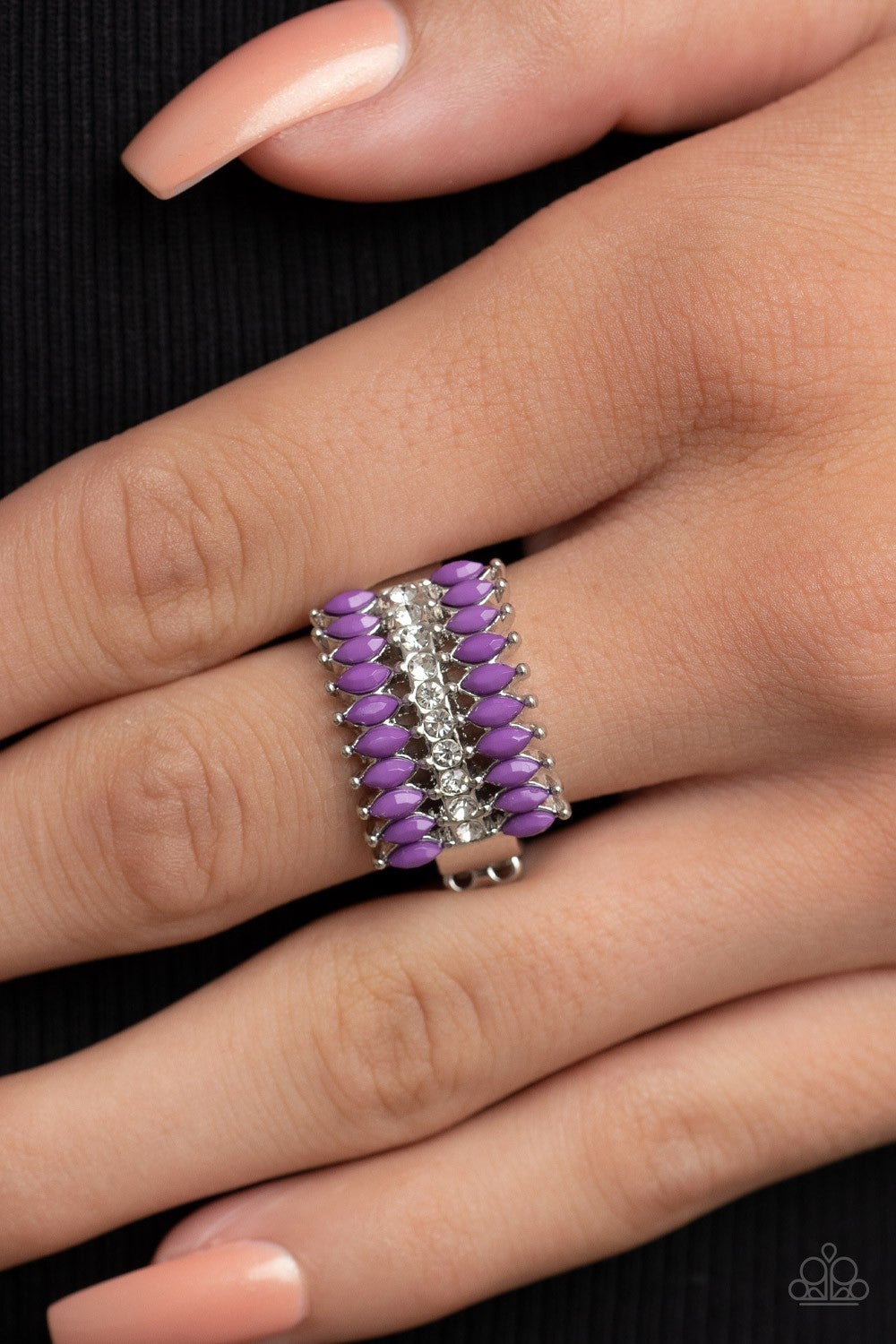 Two rows of marquise shaped purple beads are separated by a single row of glassy white rhinestones, layering into a vivacious pop of sparkle around the finger. Features a stretchy band for a flexible fit.