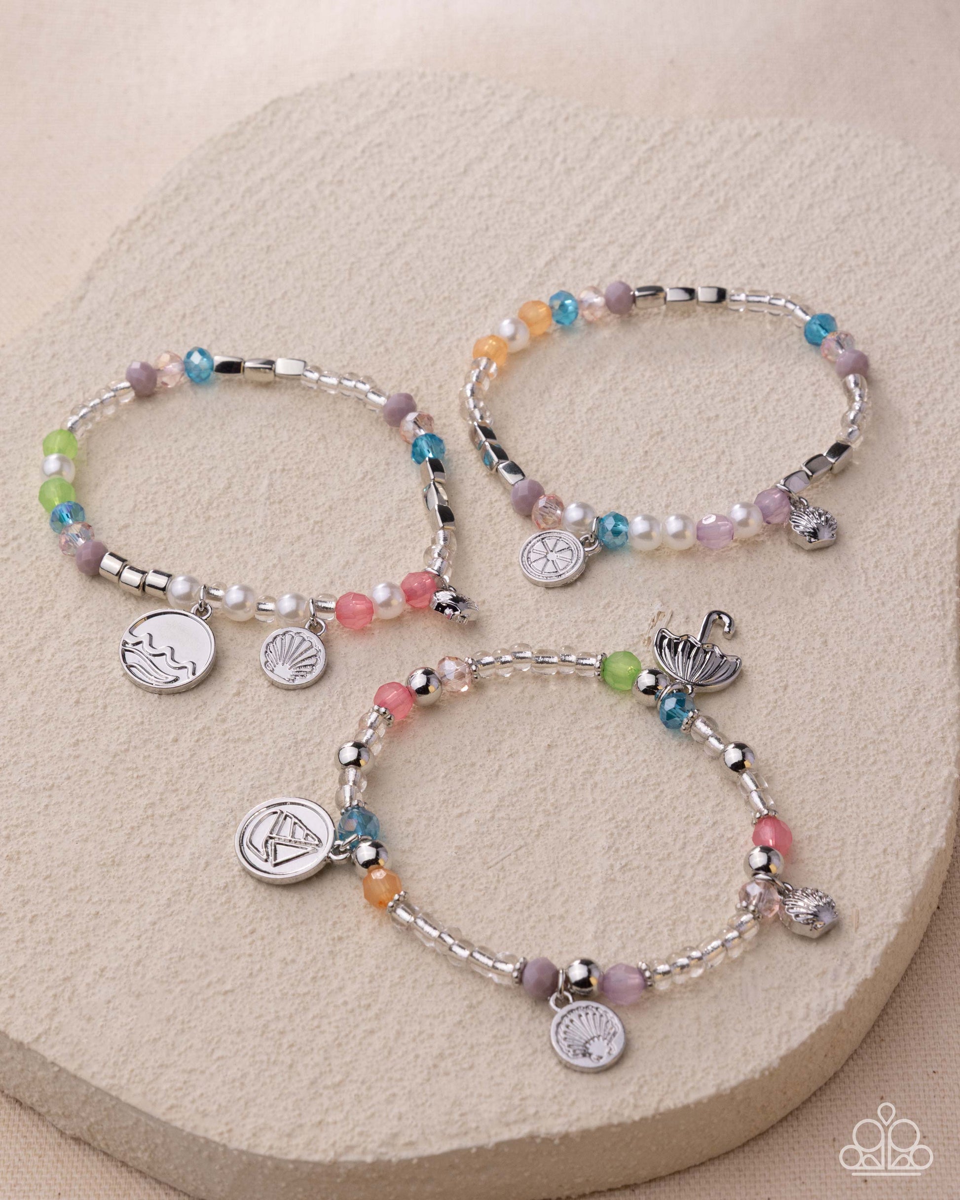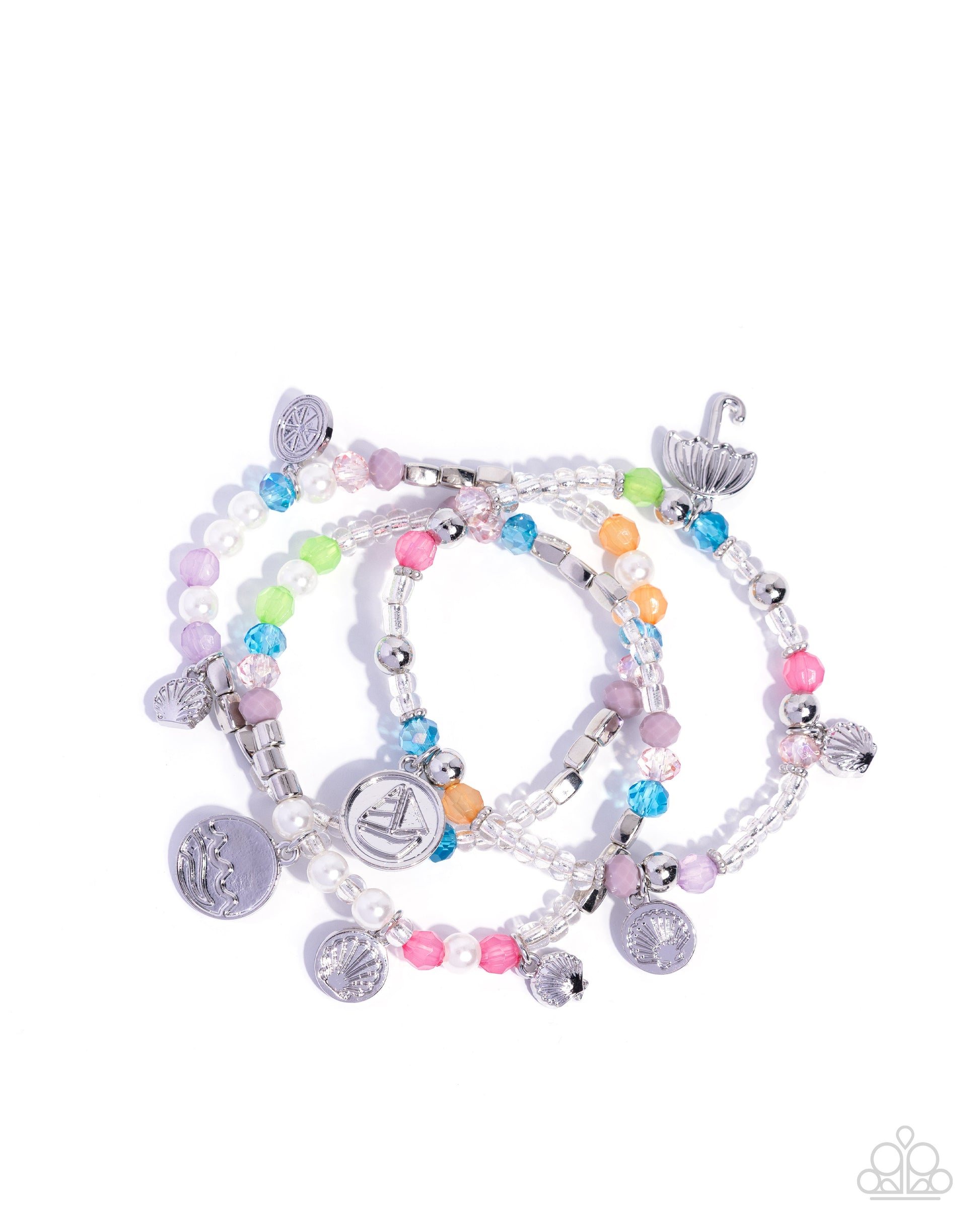 Infused along elastic stretchy bands, a collection of white pearls, silver beads, faceted multicolored beads in a variety of opacities and shimmers, and clear beads stack along the wrist for a colorful display. Coastal-inspired silver charms, including an umbrella, seashells, sand dollars, a sailboat, a wave, and a lemon slice, sporadically sway along the strands for an opulent, oceanic finish.