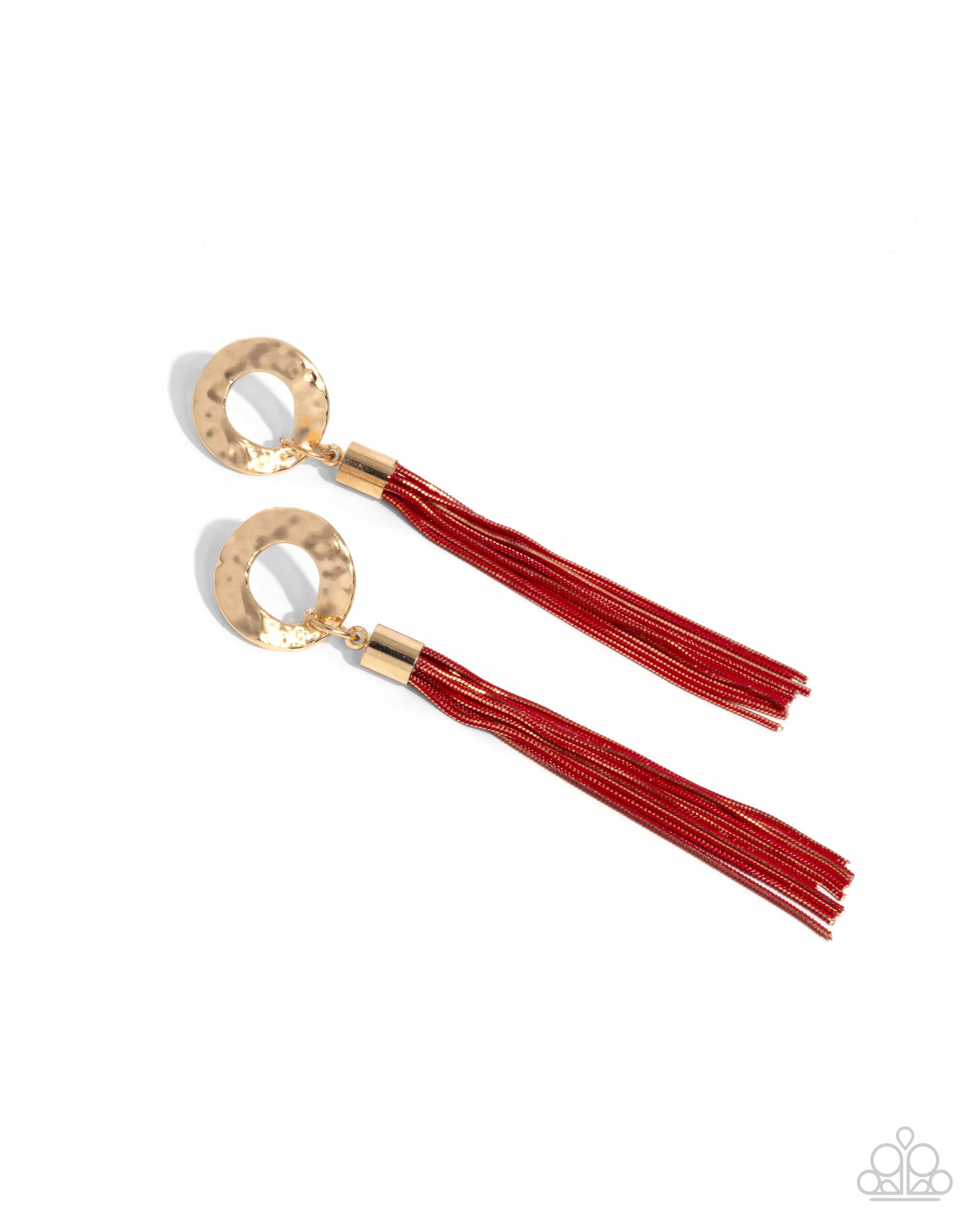 Hammered in mesmerizing detail, a high-sheen gold disc glistens from the ear. Featuring shiny gold and red links, slim snake chains sway below the hammered disc from a gold cap fitting for an edgy mixed metallic lure. Earring attaches to a standard post fitting.