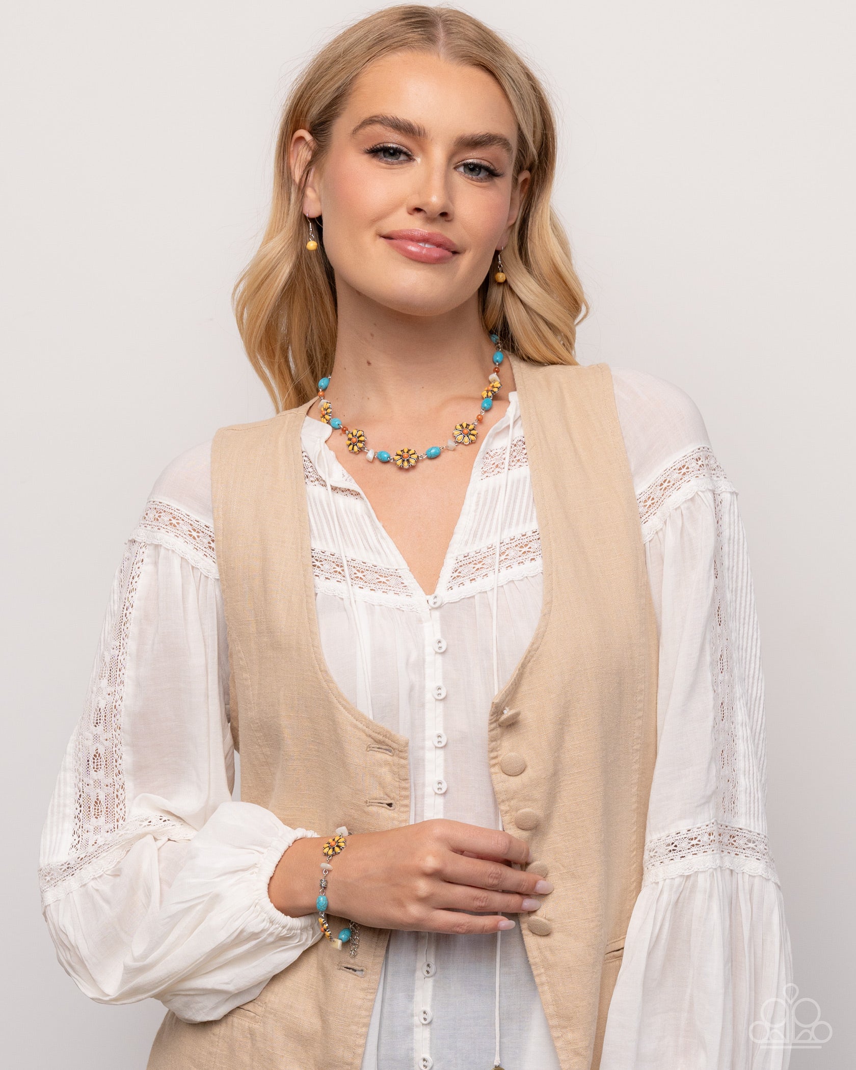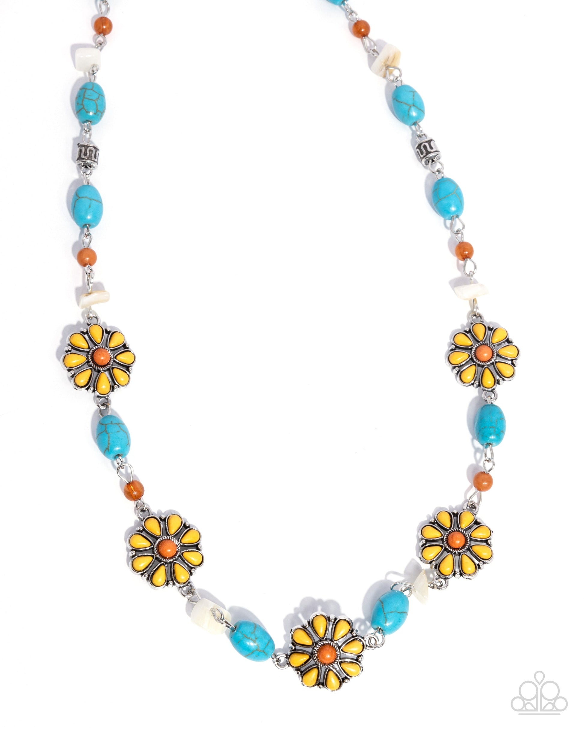 Featuring a Buckthorn Brown stone center, a collection of yellow stone teardrop petals bloom out along the neckline for a whimsical floral display. Additional turquoise stone beads, chiseled white acrylics, textured silver discs, and Buckthorn Brown acrylics are also infused along the neckline for additional earthy detail and texture. Features an adjustable clasp closure. As the stone elements in this piece are natural, some color variation is normal.