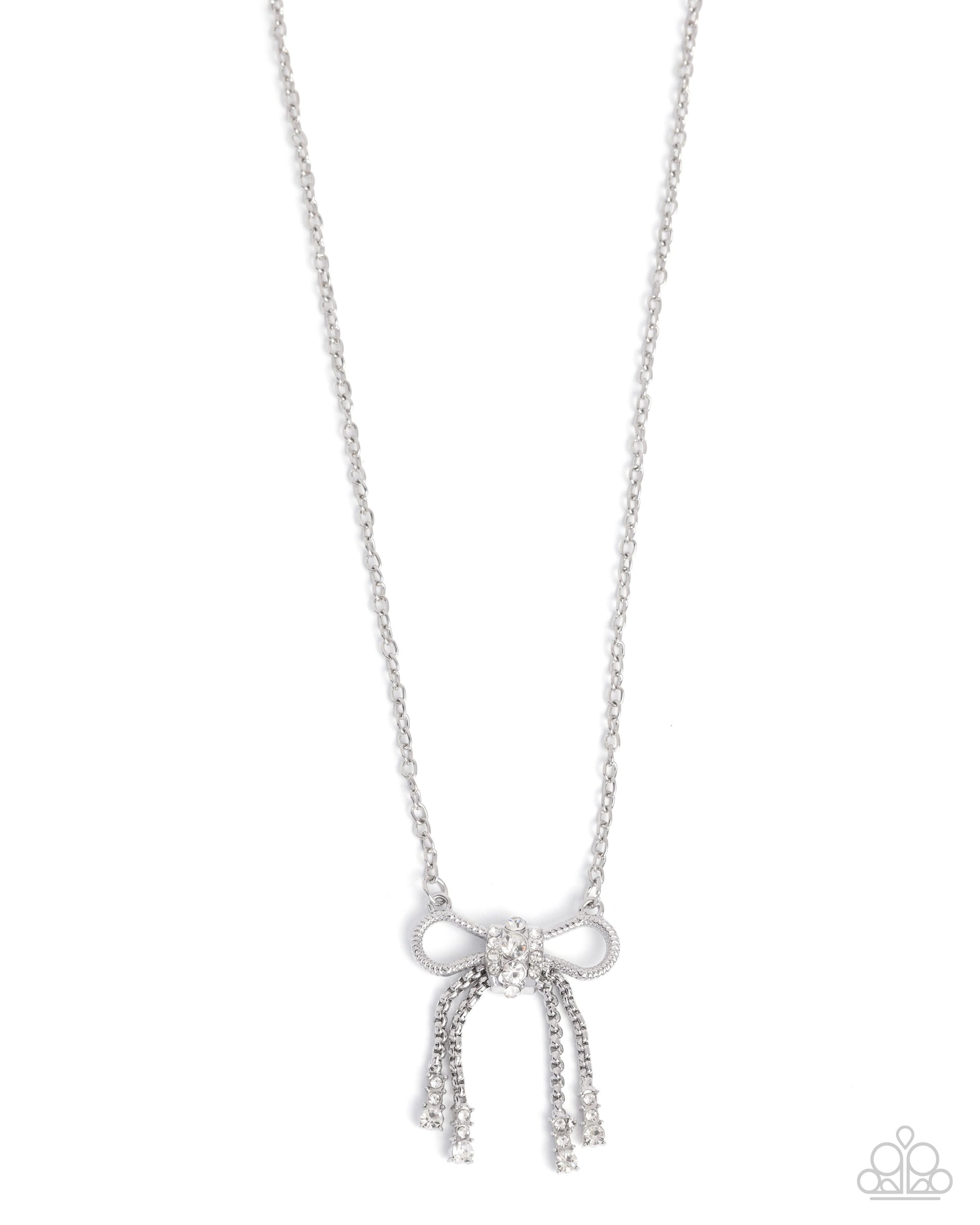 A dainty silver chain is adorned with a sparkling bow pendant. Featuring textured details, the bow is crowned with a cluster of rhinestones and embellished with rhinestone-studded tassels for a charming finish. Features an adjustable clasp closure.