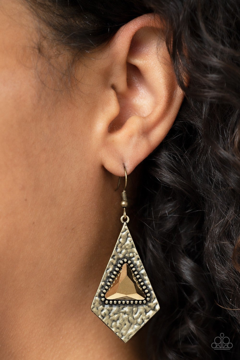 Bordered in dainty brass studs, an aurum triangular gem is pressed into the center of a hammered brass kite shaped frame for an edgy shimmer. Earring attaches to a standard fishhook fitting.