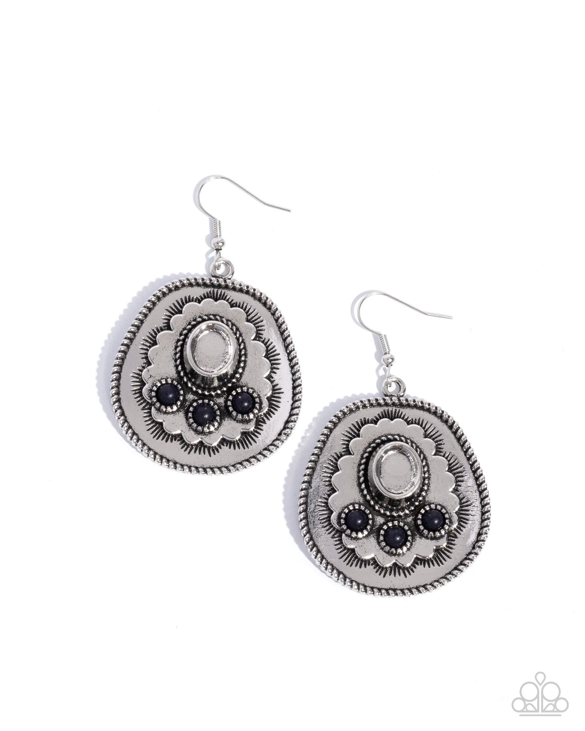 Studded across the top of an intricately stamped and detailed silver cowboy hat, a trio of black stones glistens for a Southwestern-inspired statement. Earring attaches to a standard fishhook fitting. As the stone elements in this piece are natural, some color variation is normal.