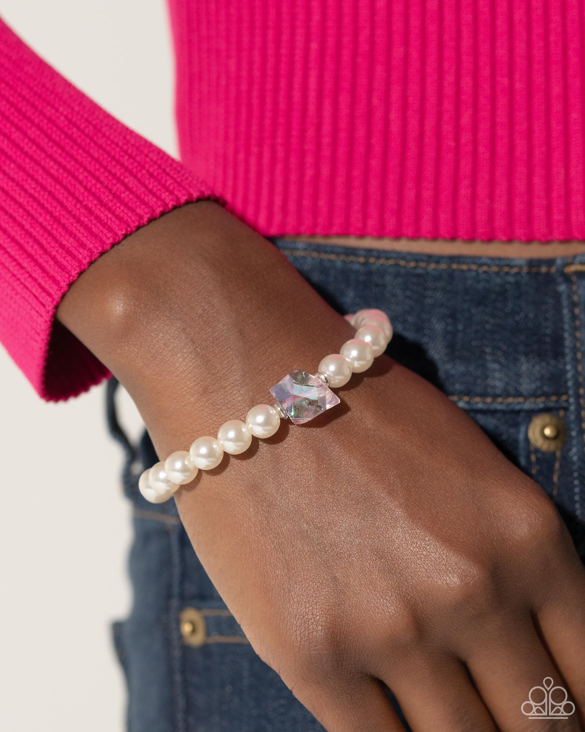 Infused along an elastic stretchy band, a collection of refined white pearls coalesces around the wrist. An abstract, cubed purple clear bead interrupts the pearls for a touch of feminine color.