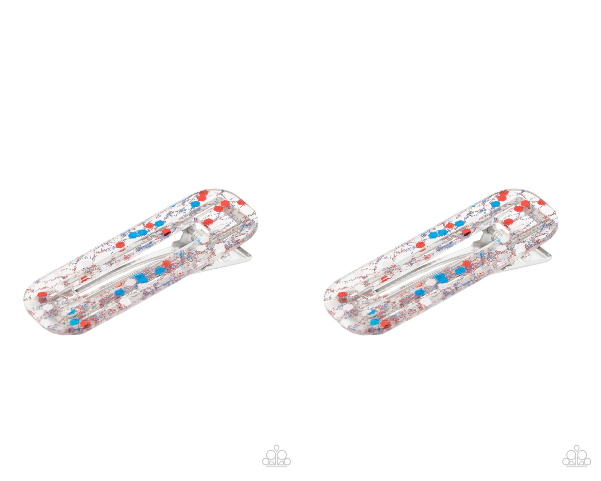 A shimmery collection of red, white, and blue confetti and dainty sparkles are encased in a clear acrylic frame atop a silver frame. Features a standard hair clip on the back.