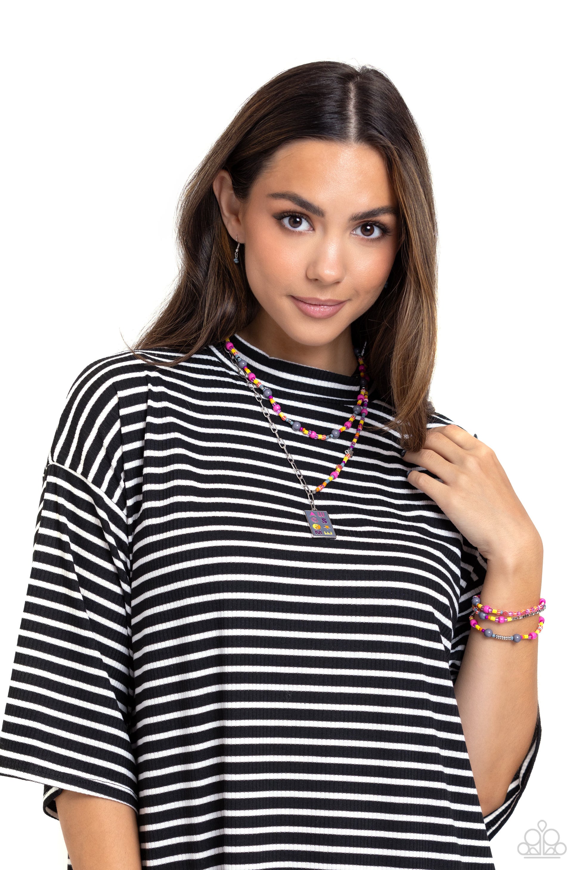 A strand of silver paperclip chain collides with a mismatched layer of various gray, orange, yellow, purple, and Rose Violet seed beads with silver accents to create an abstract blend of color and glitz. A gray-painted rectangle pendant, featuring the word "AWESOME" in various colors with fun shapes making up some of the letters, dangles from the bottom of the abstract display for additional fun-loving flourish. A similarly-beaded chain hovers above the bodacious collection, perfectly balancing the contrasting design. Features an adjustable clasp closure.