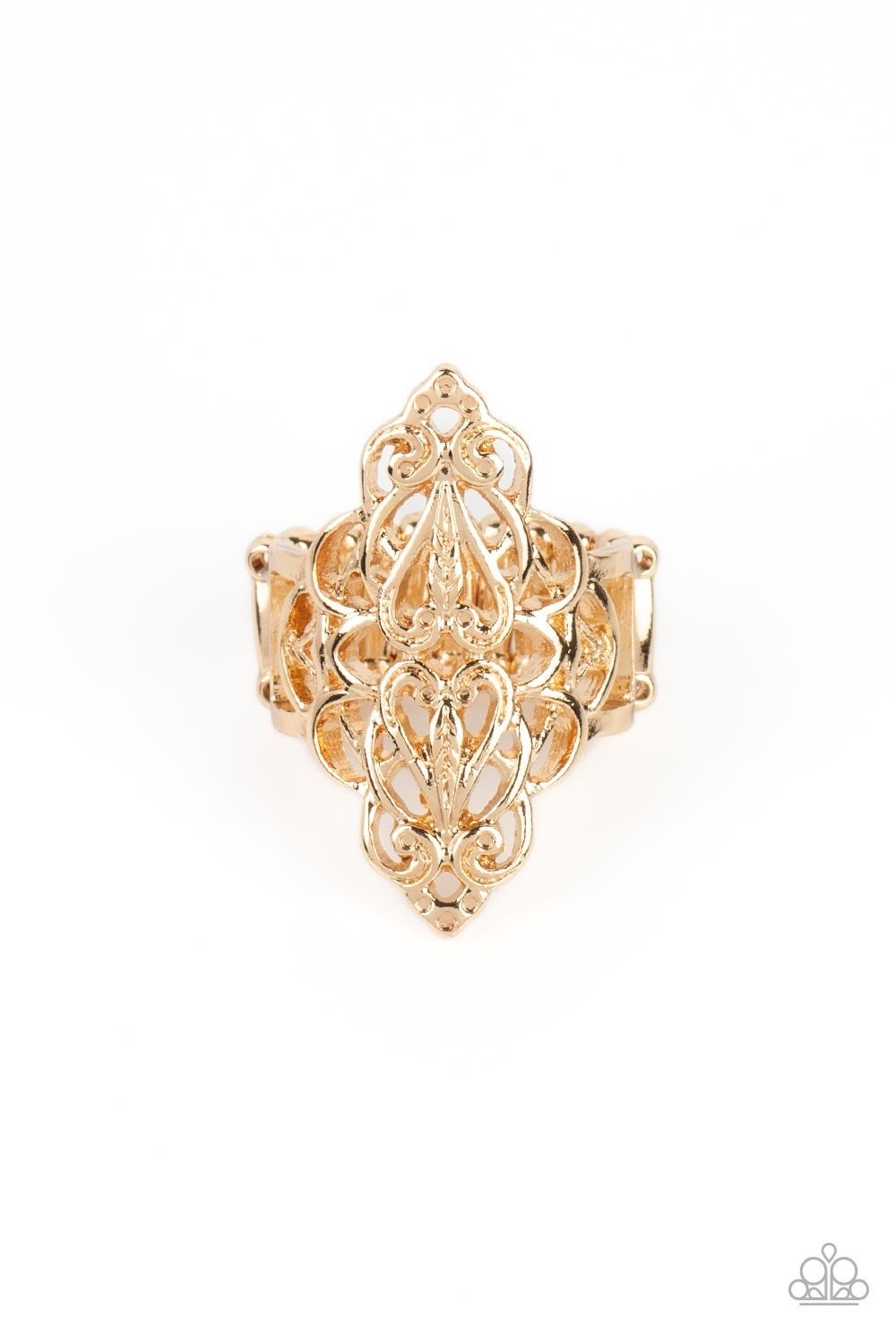 Shiny gold filigree curls into a marquise-shaped display atop the finger. The stenciled design allows the skin to peek beneath the airy pattern for a regal finish. Features a stretchy band for a flexible fit.