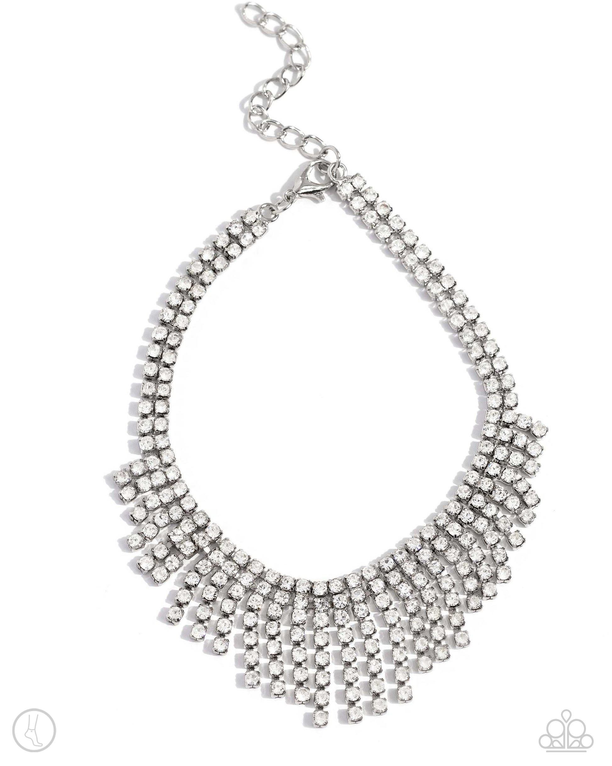A sassy curtain of mismatched white rhinestone-encrusted silver box chains tapers from the bottom of a double-stranded dramatic row of glassy white rhinestones delicately pressed in silver square fittings. The exaggerated fringe cascades around the ankle, resulting in a dauntless attitude that demands attention with every swish. Features an adjustable clasp closure.