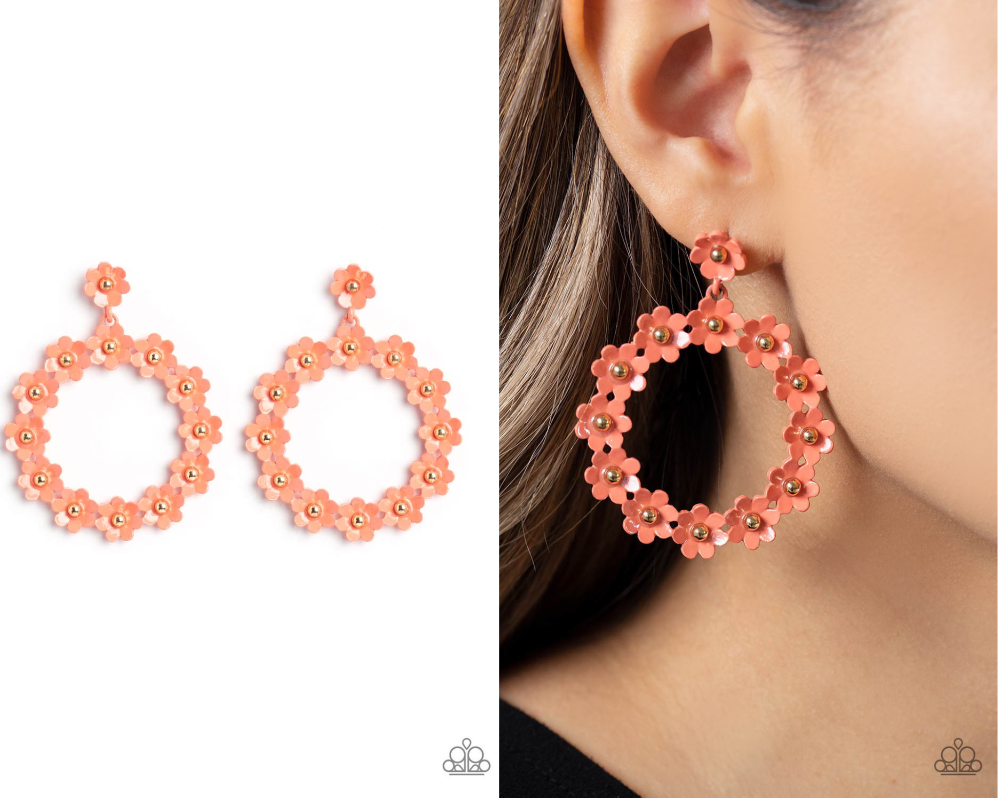 Hanging from a solitaire coral daisy, a dainty collection of coral daisies bloom into a free-spirited wreath below the ear. Gold studs gleam from the centers of the tactile flowers, adding an industrial sheen to the display. Earring attaches to a standard post fitting.