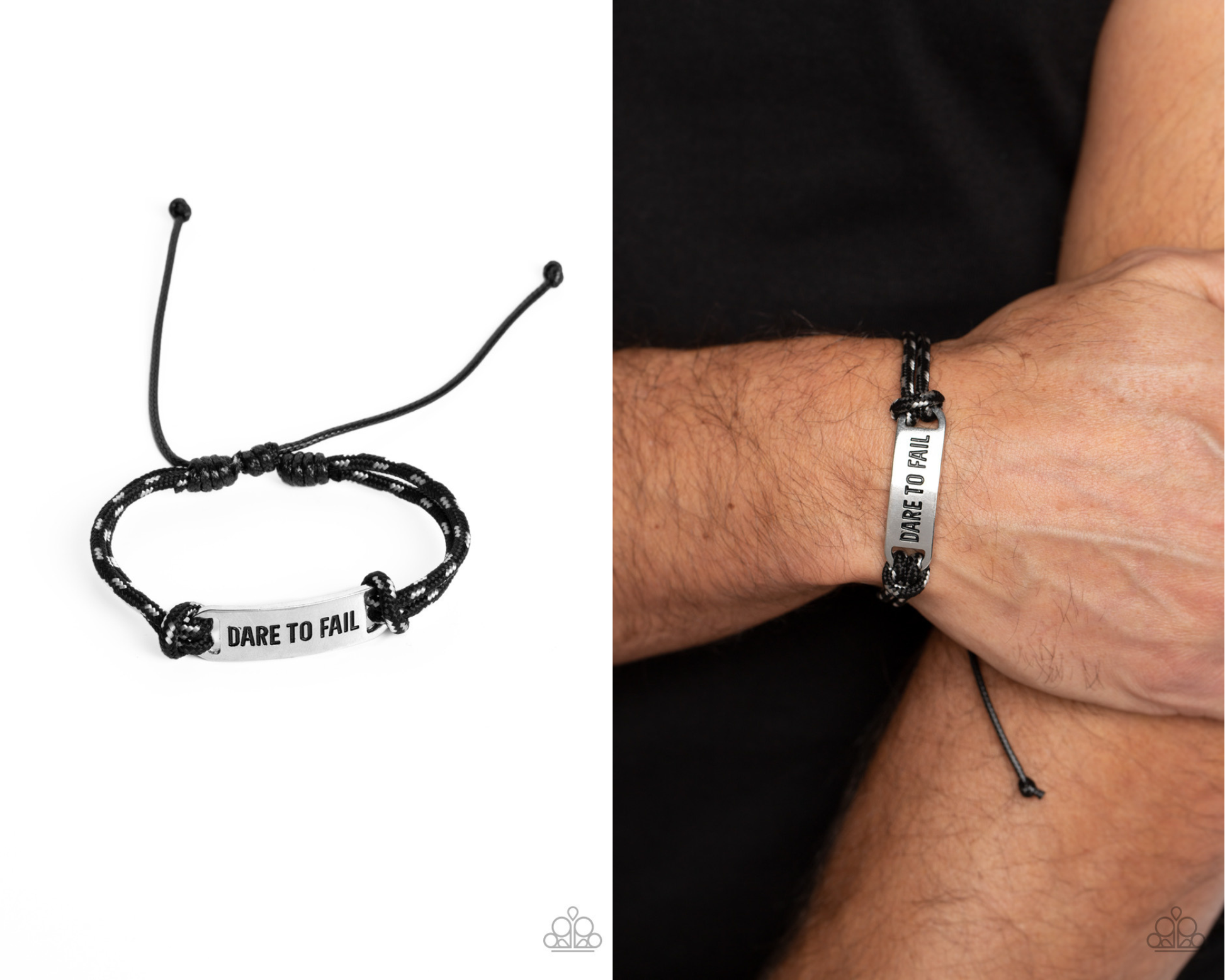 Black paracord rope, sporadically dotted with white spots, encircles a square silver pendant. Featured on the pendant, the phrase "Dare to Fail" is stamped in bold lettering for an urban, inspirational statement around the wrist. Features an adjustable sliding knot closure.