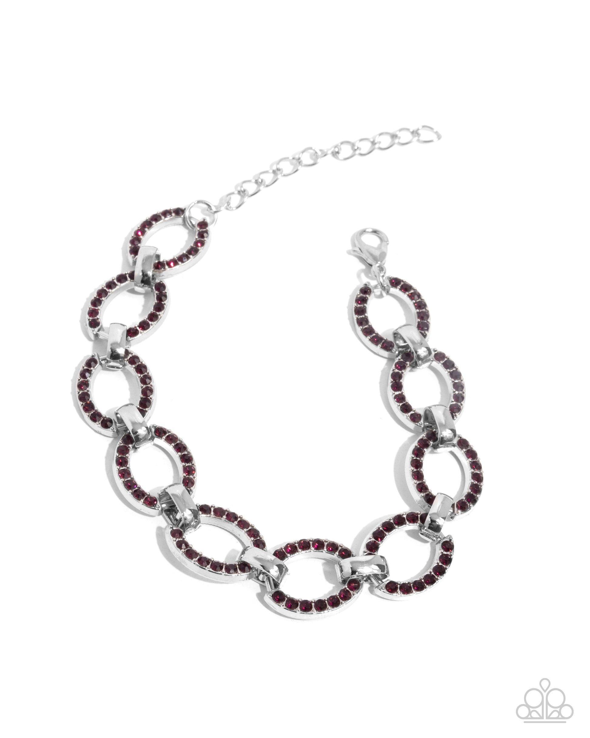 A glitzy series of sparkly purple rhinestone encrusted oval silver frames delicately links with shiny silver fittings around the wrist, invoking a timeless twinkle. Features an adjustable clasp closure.