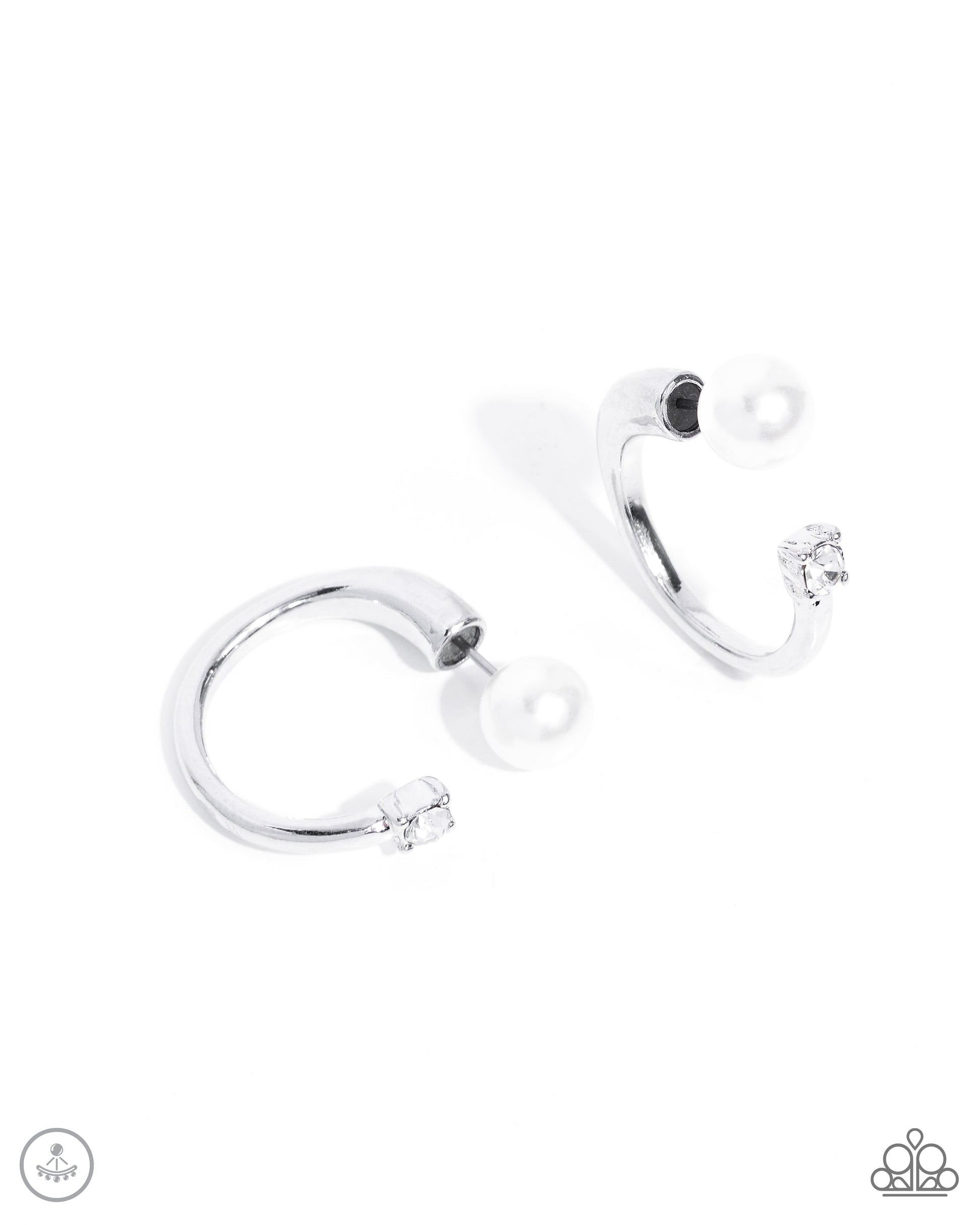 A solitaire glossy white pearl attaches to a double-sided silver hoop post, designed to fasten behind the ear. The glitzy double-sided post peeks out beneath the ear for a refined look, featuring a faceted dainty white rhinestone pronged in a square fitting for additional eye-catching detail. Earring attaches to a standard post fitting. Hoop measures approximately 3/4" in diameter.