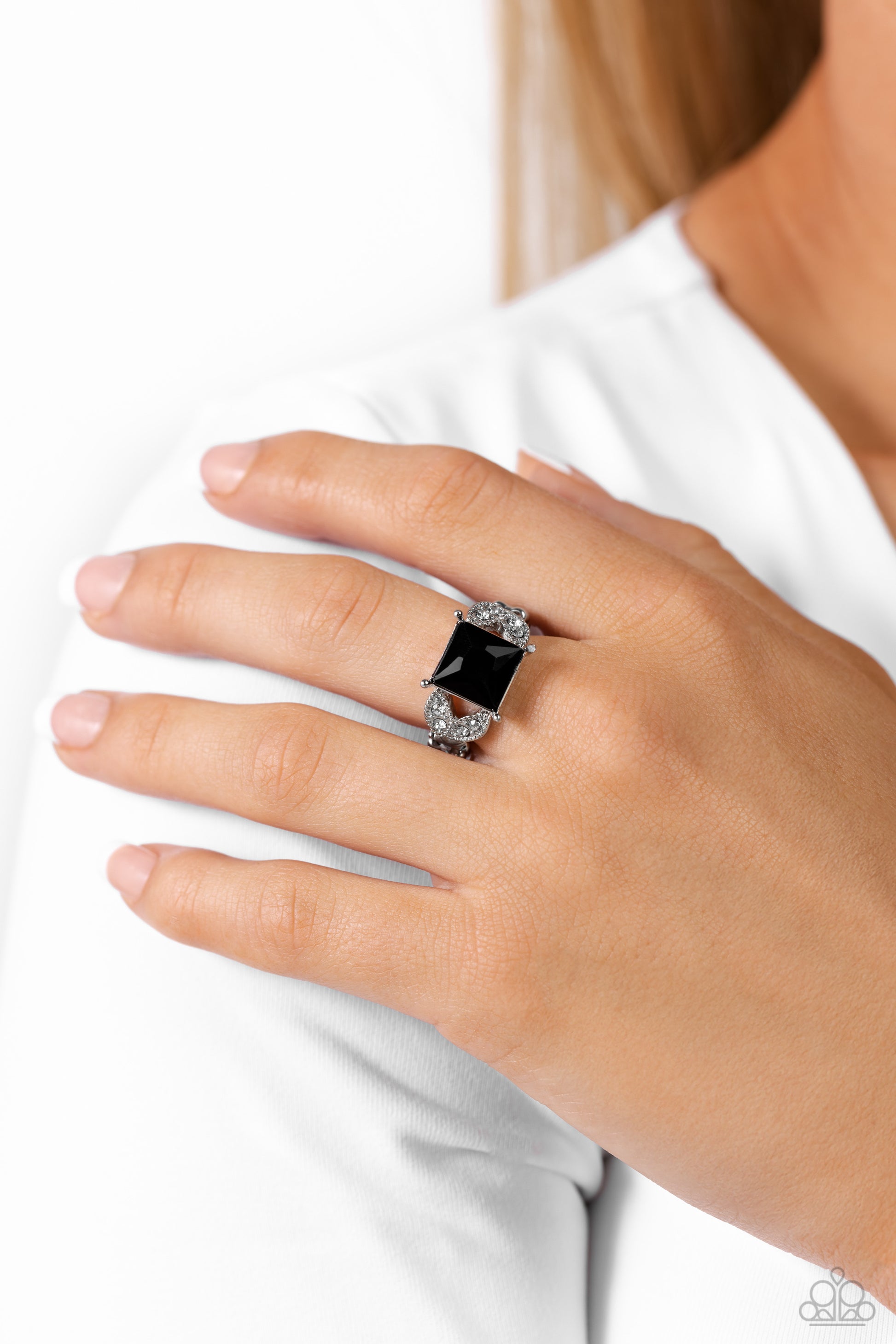 A stunning square-cut jet black rhinestone stands in the spotlight atop silver marquise-shaped frames. The marquise-shaped frames are encrusted with dainty sparkling rhinestones in a dramatic finish. Features a dainty stretchy band for a flexible fit.