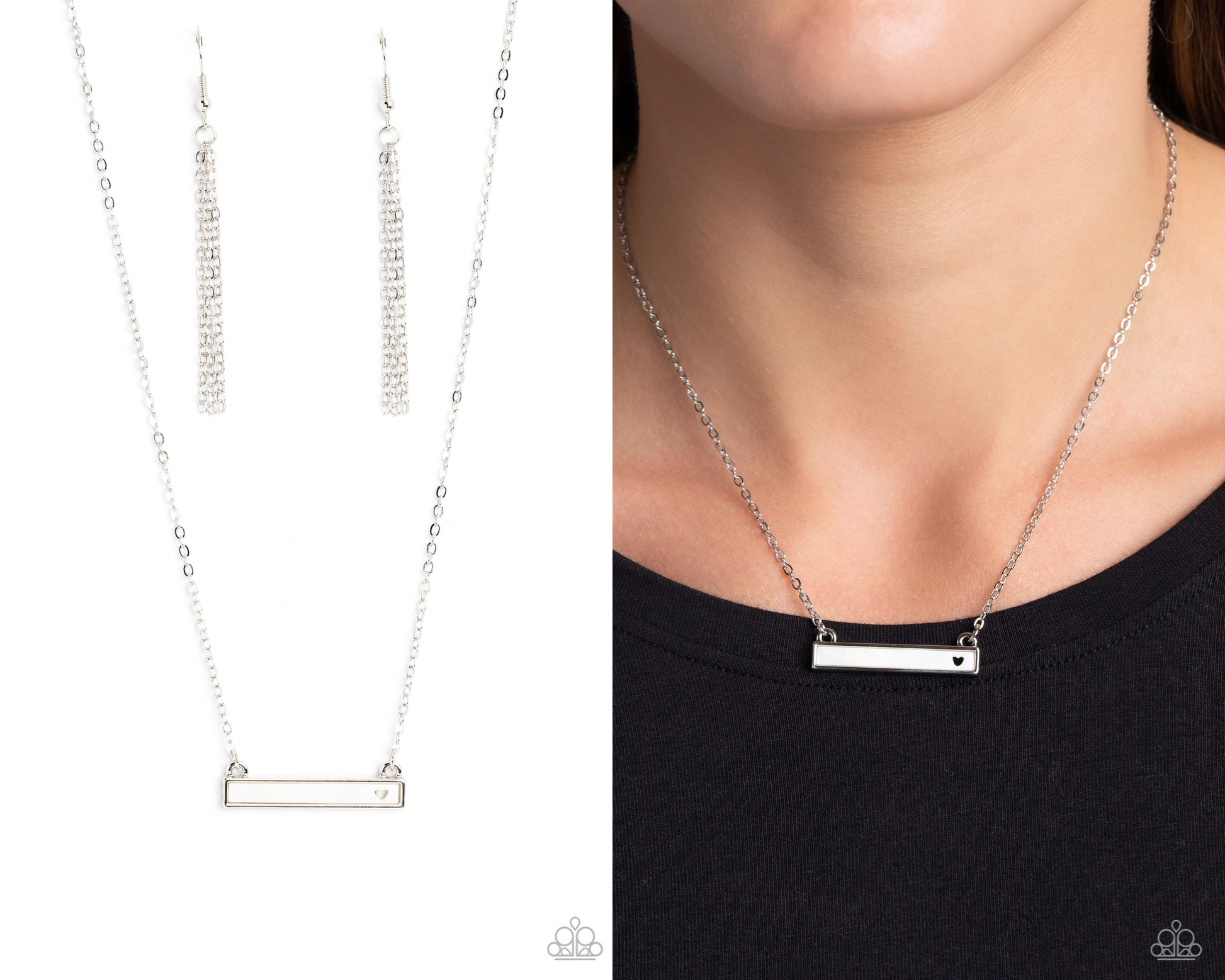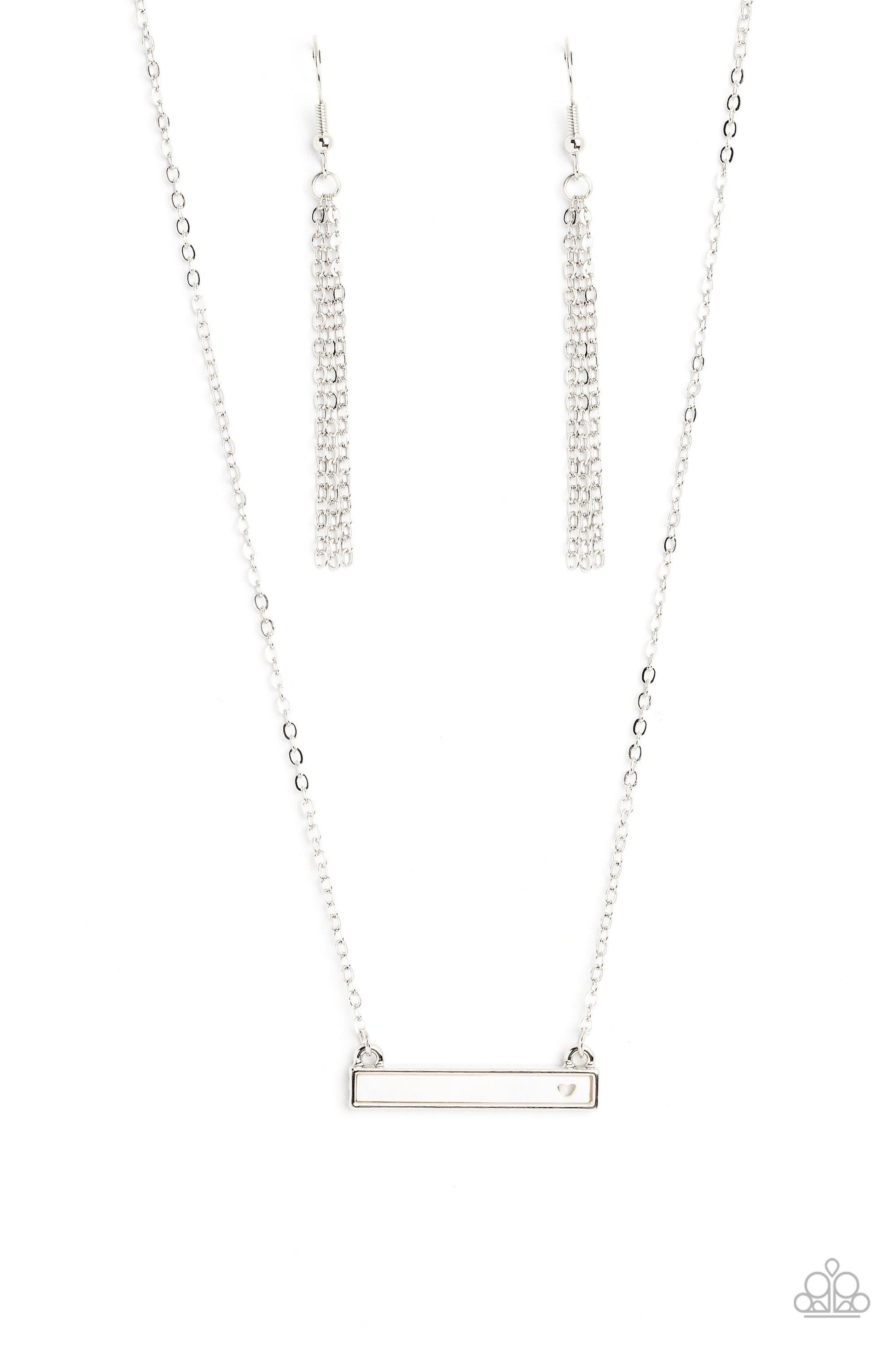 Featuring a dainty heart cutout, a rectangular white shell, pressed in a silver plate is suspended below the collar by a dainty silver chain, creating a whimsically romantic pendant. Features an adjustable clasp closure.