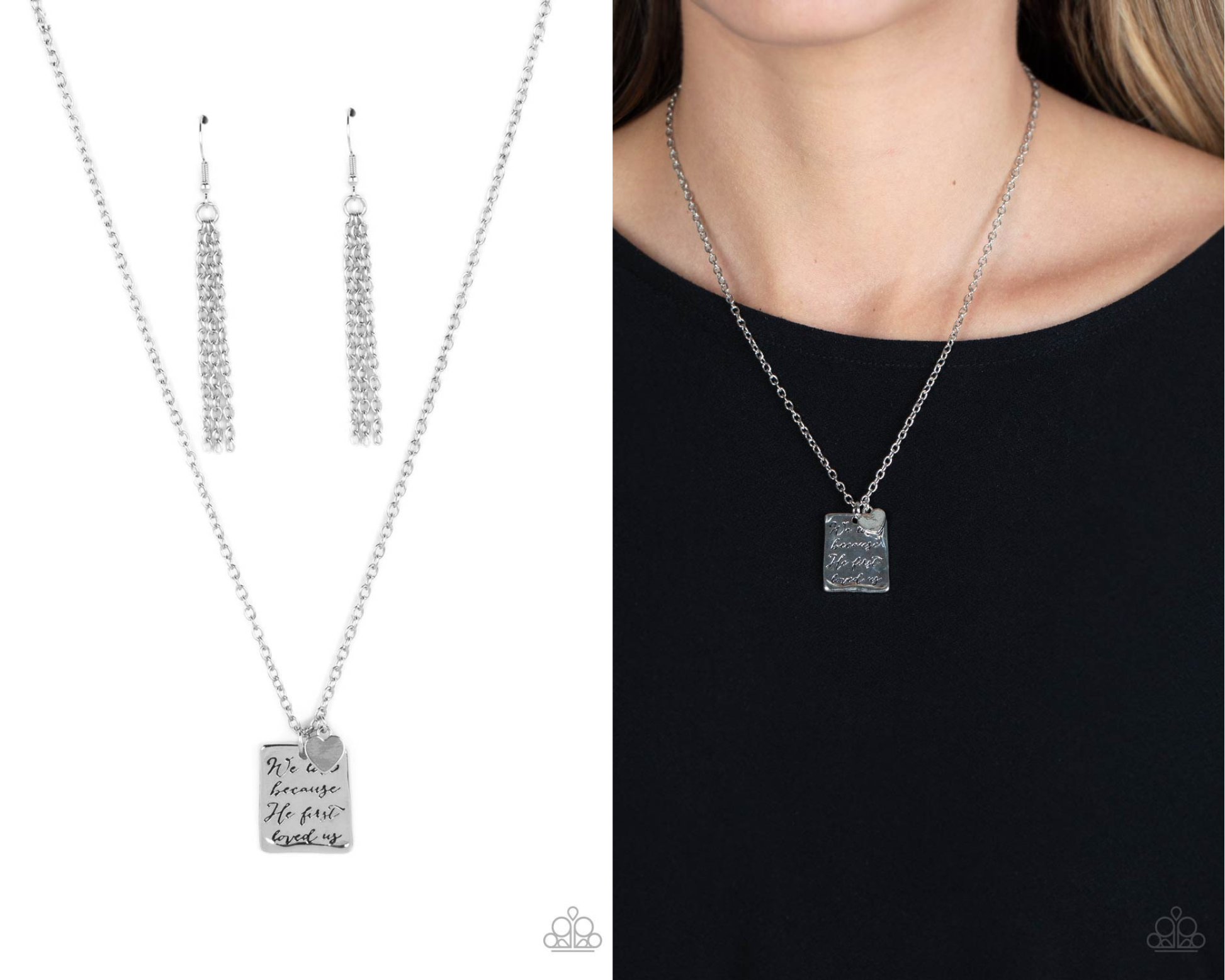 Dangling below a delicate silver chain, a hammered rectangular plate swings for some light-catching movement. The religious phrase "We love because He first loved us" is prominently stamped in the center of the hammered surface in an antiqued, scripted font. A silver heart charm glides just above the rectangular plate for a vintage-inspired finish. Features an adjustable clasp closure.