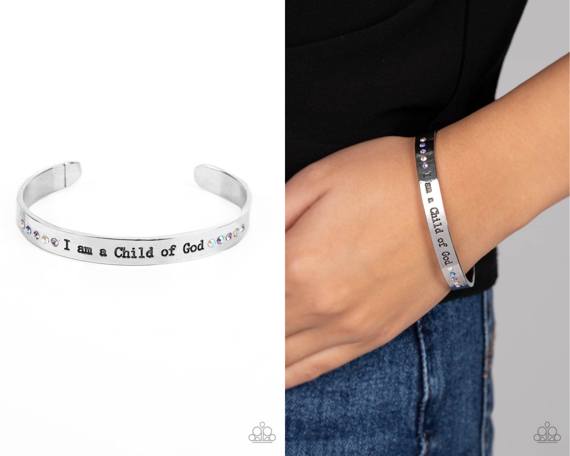 A shiny silver cuff stamped with the phrase "I am a Child of God" encircles the wrist. Dainty sapphire, violet and iridescent rhinestones shimmer at the borders of the phrase for a whimsical finish. Due to its prismatic palette, color may vary.
