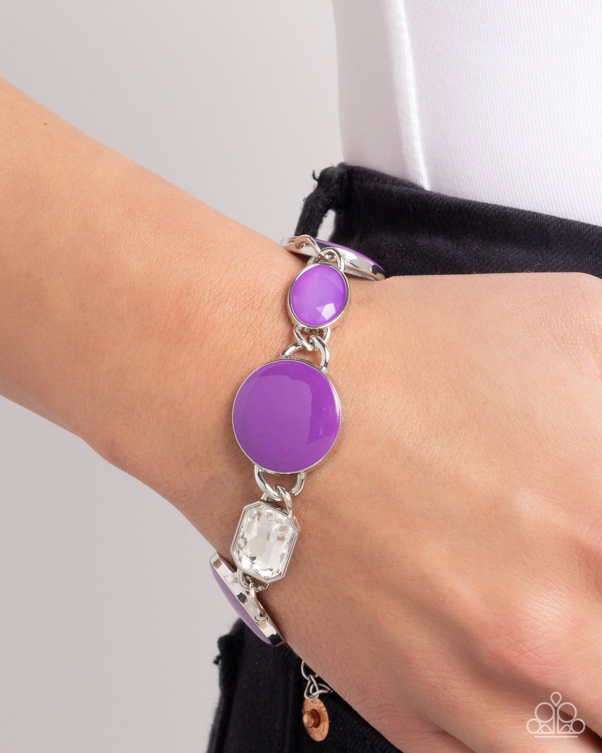 A rectangular sparkling white gem and a Dahlia oval bead add elegance to a monochromatic collection of three oversized Dahlia circles. Set in silver frames, the whimsical collection attaches to a silver chain, for a vivacious splash of color around the wrist. Features an adjustable clasp closure.