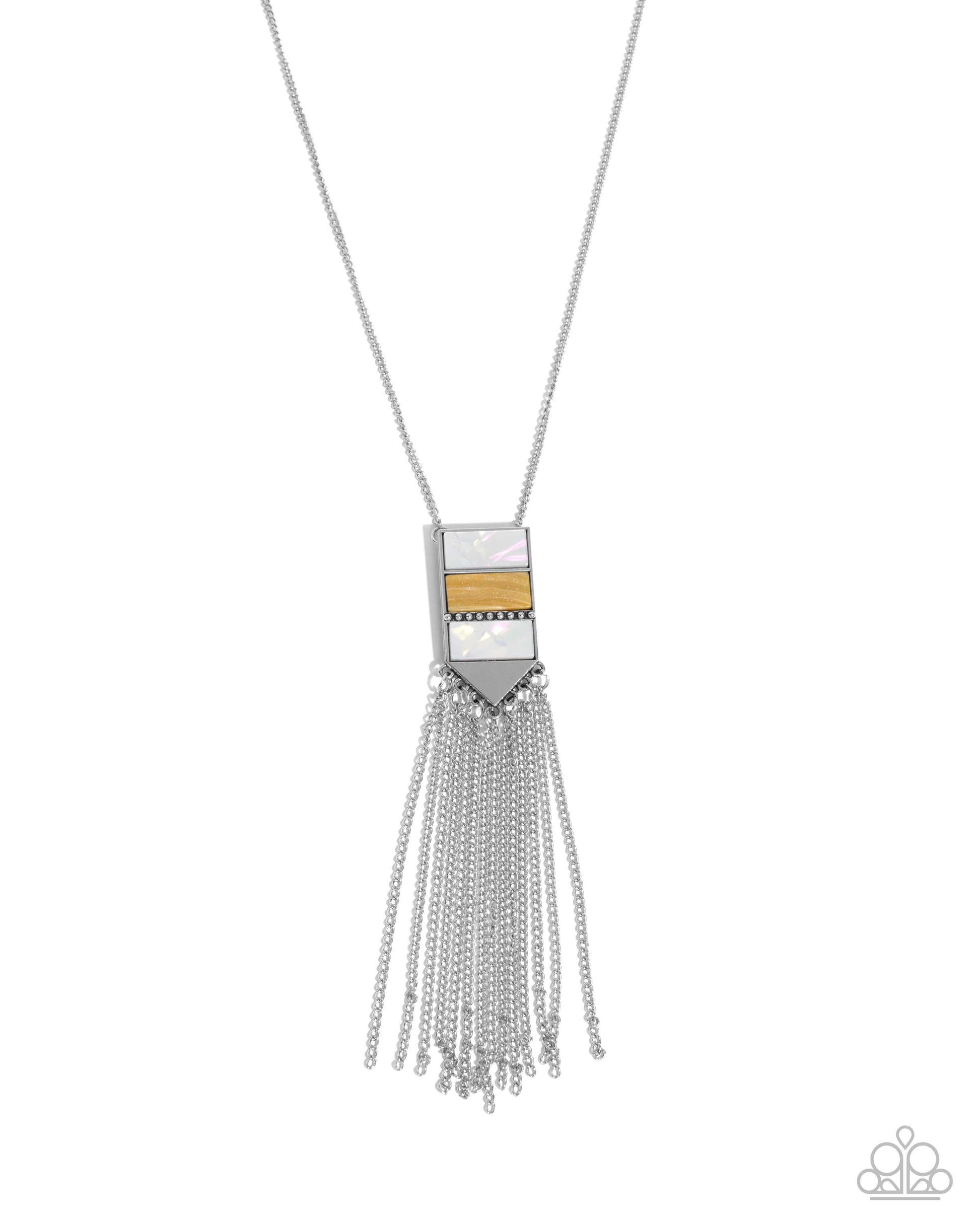 Pressed in a shield-like pendant, rectangular white shells, a yellow-striped stone, a row of silver studs, and a silver triangle gather along an extended silver chain creating a trendy art deco-inspired pendant. A tapered display of classic silver chains streams from the bottom of the pendant adding an eye-catching handcrafted finish. Features an adjustable clasp closure. As the stone elements in this piece are natural, some color variation is normal.