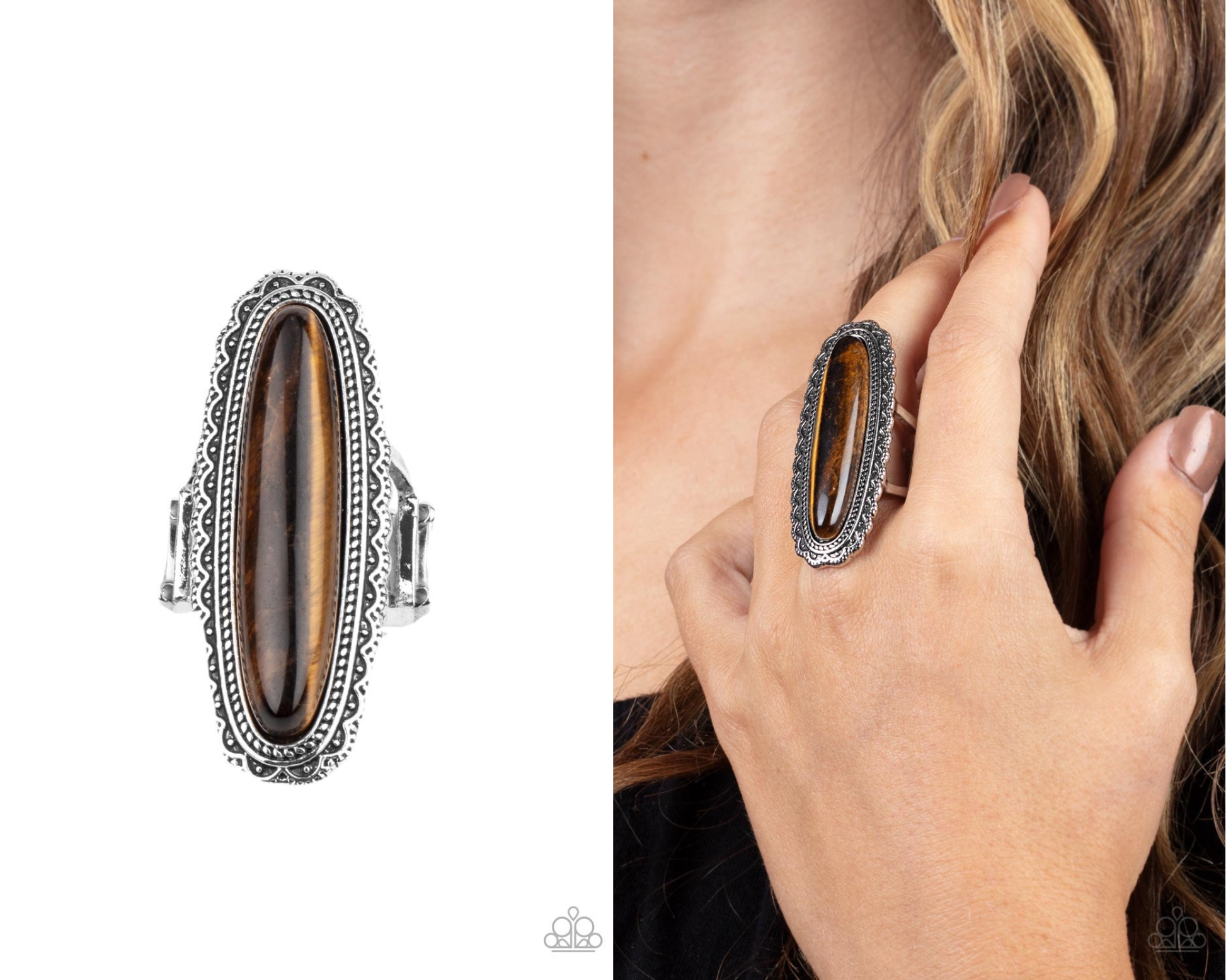 An elongated oval tiger's eye stone embellishes the center of a decorative studded silver frame, creating an exaggerated earthy centerpiece. Features a stretchy band for a flexible fit.
