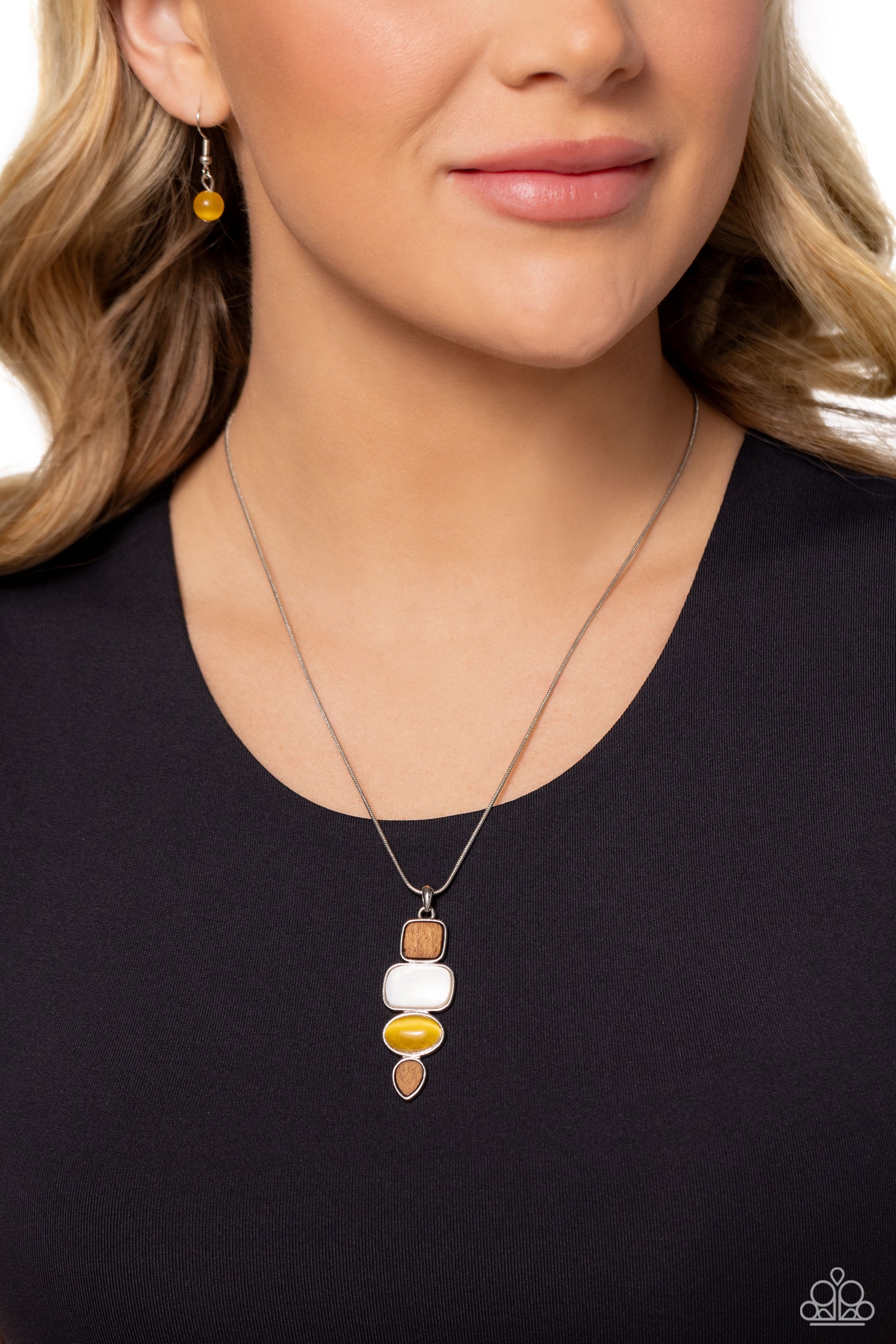 Encased in sleek silver fittings, an earthy collection of wooden, white stone, and yellow cat's eye frames stack at the bottom of a dainty silver snake chain for a tranquil fashion. Features an adjustable clasp closure.