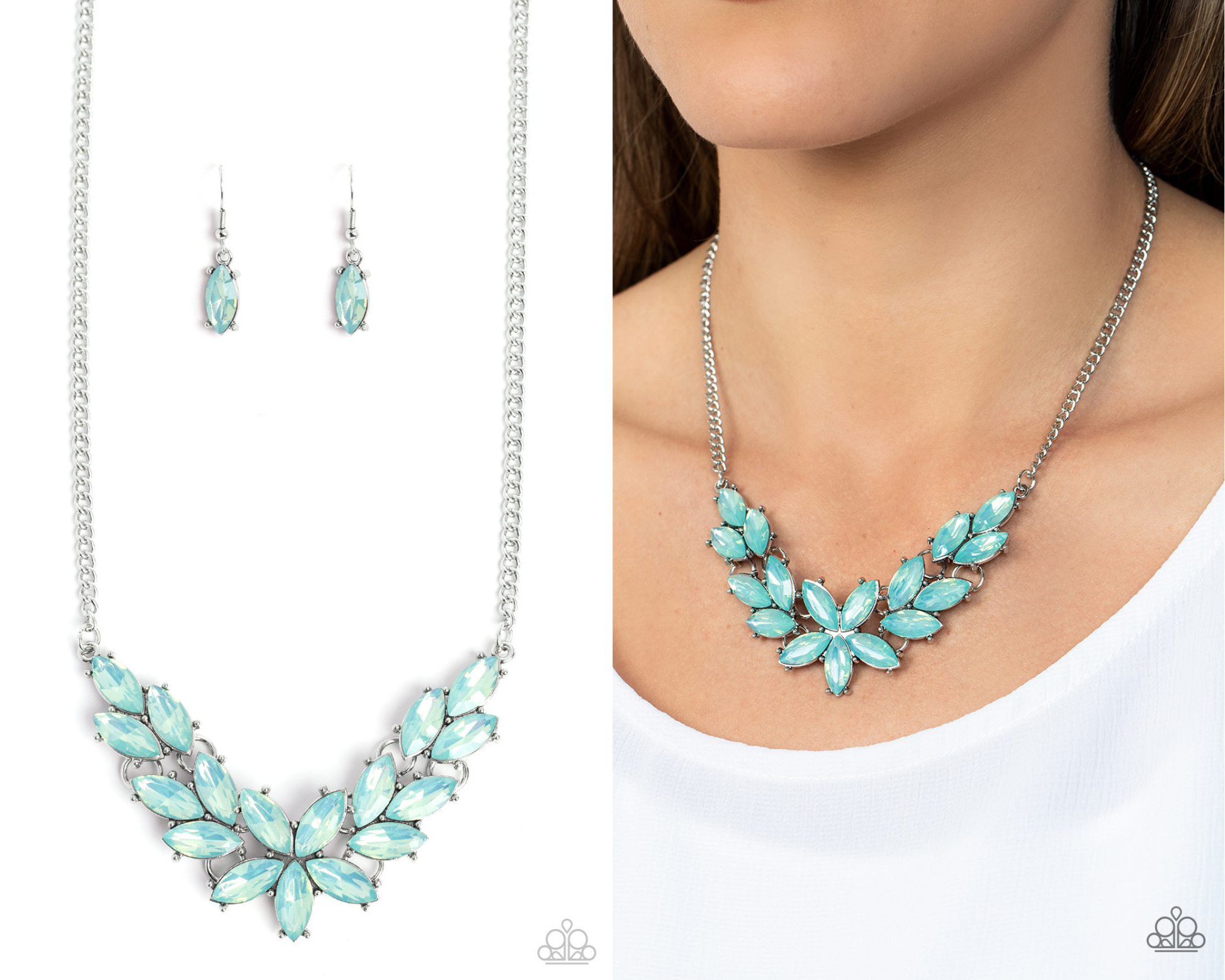 An opaque collection of marquise cut green gems delicately fans out below the collar, resulting in an ethereal floral centerpiece. Features an adjustable clasp closure.