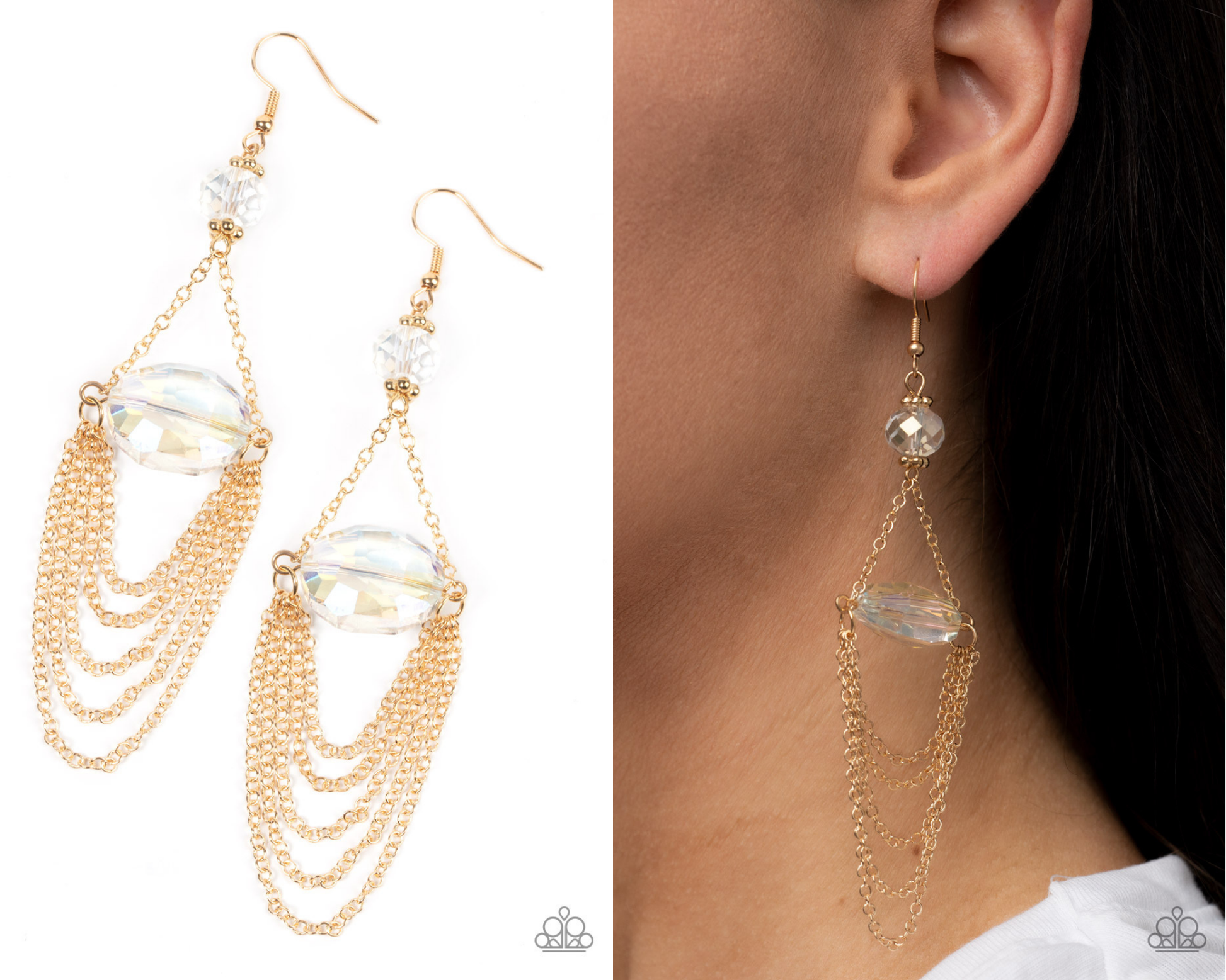 Tiers of dainty gold chains delicately layer from an oversized oval iridescent gem that is suspended from a faceted white crystal-like bead, resulting in an ethereal chandelier. Earring attaches to a standard fishhook fitting.