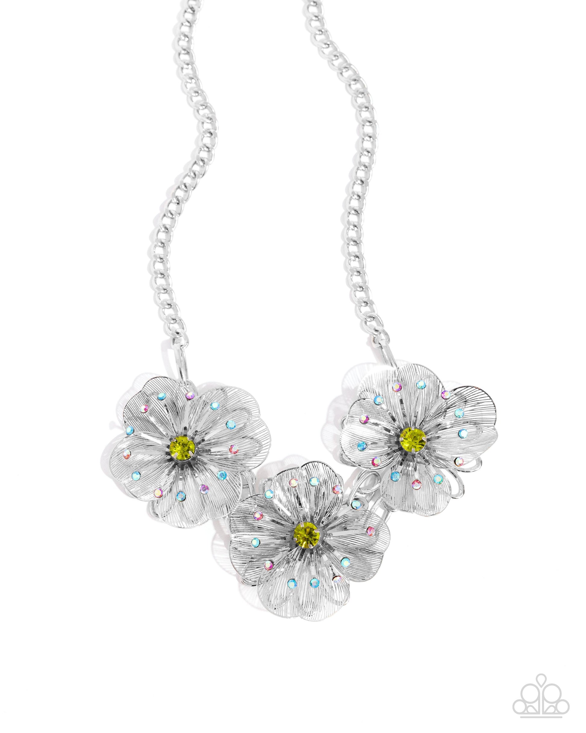 Dotted with olive gem centers, a trio of airy wiry silver flowers blooms below the neckline from a silver curb chain for an adorable arrangement. Dotted with aquamarine and light rose iridescent rhinestones, alternating silver filaments curl up and outwards from the olive centers for additional whimsical color. Features an adjustable clasp closure. Due to its prismatic palette, color may vary.