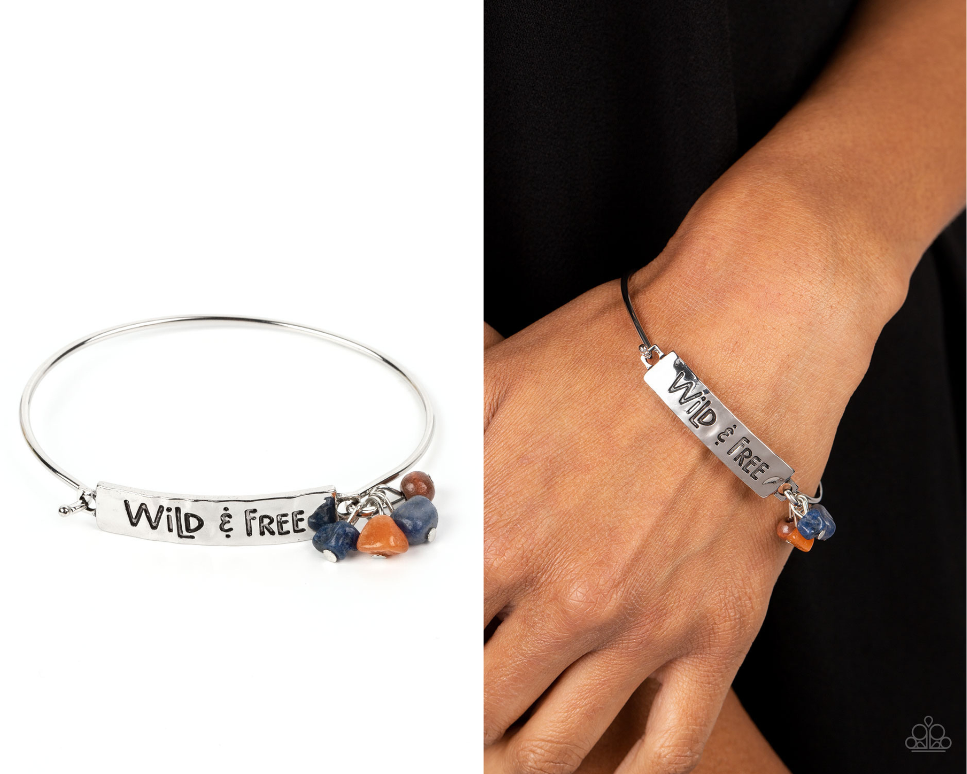 The words "Wild & Free" are stamped across a thick plate of silver in a playful font. An orange stone and two lapis stones combine with a brown wooden bead, gathering at the side of the inspirational centerpiece as it connects to a skinny silver bar that wraps around the wrist. Features a hook and eye closure. As the stone elements in this piece are natural, some color variation is normal.